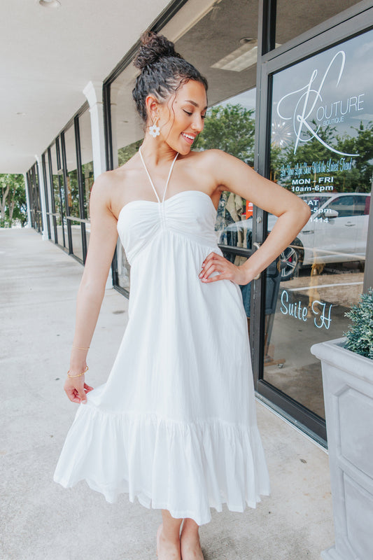 White Ruched Halter Midi Dress