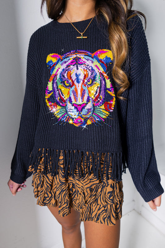 Queen of Sparkles Rainbow Tiger Head Fringe Sweater