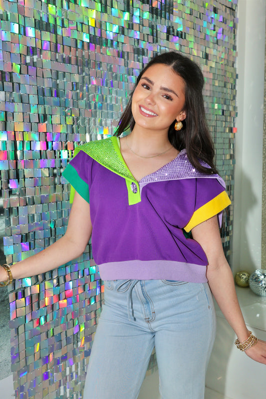 Queen Of Sparkles Mardi Gras Colorblock Rhinestone Top