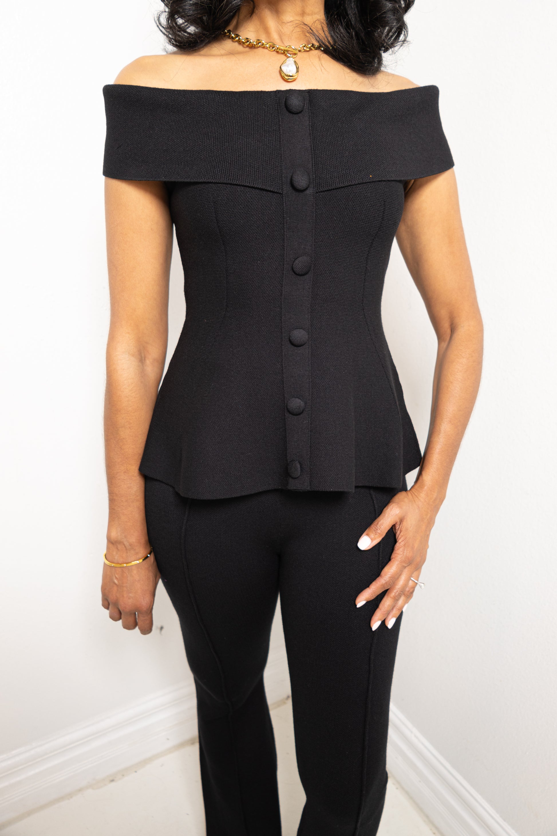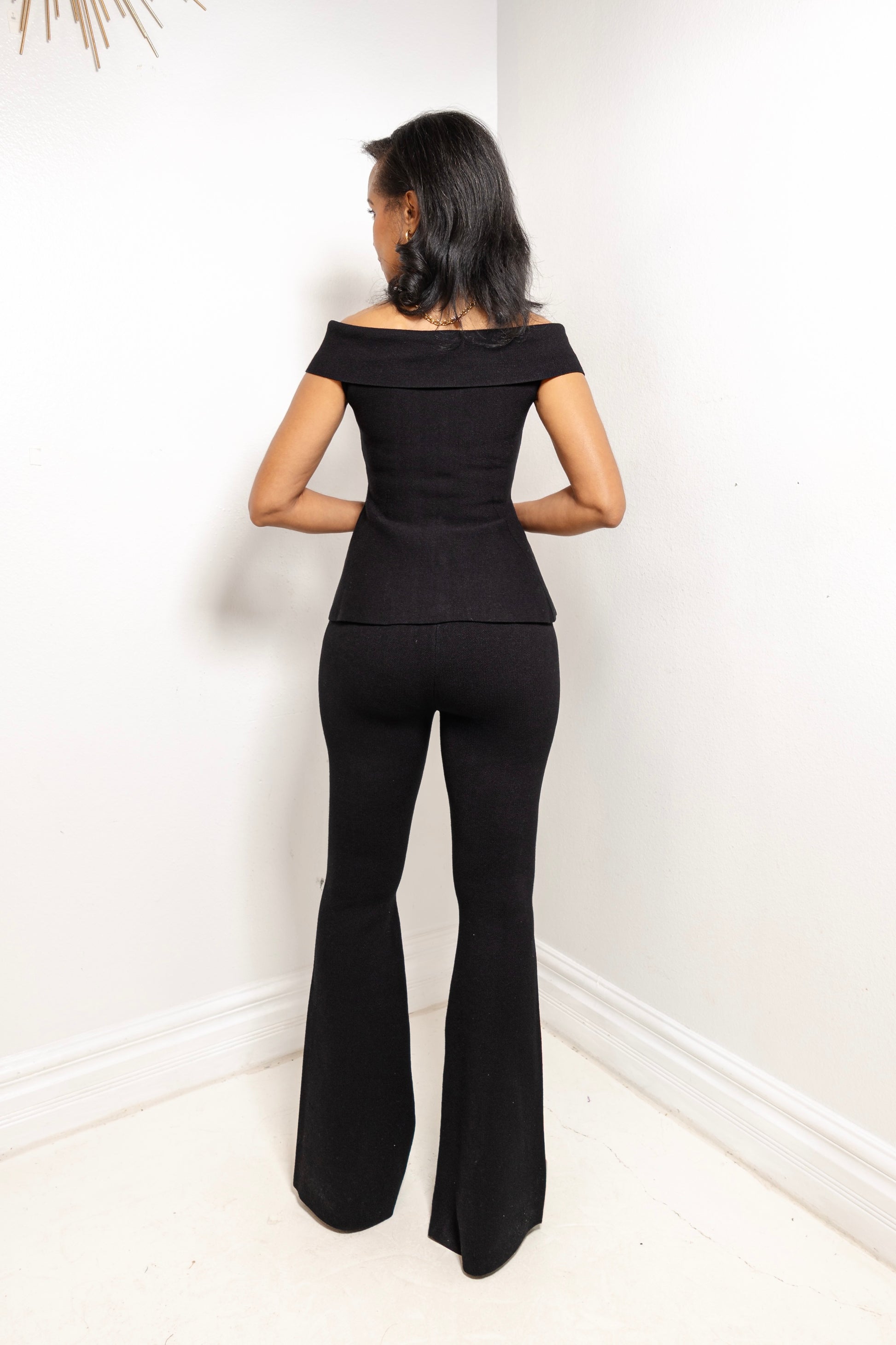 Step into sophistication with the After Hours Knit Set, designed to take you seamlessly from dinner to cocktails. This chic two-piece features an off-shoulder knit top with bold button detailing and a subtle peplum hem, paired with figure-hugging flared pants that elongate your silhouette. Effortlessly polished yet comfortable, it’s your new go-to for nights that call for timeless elegance.