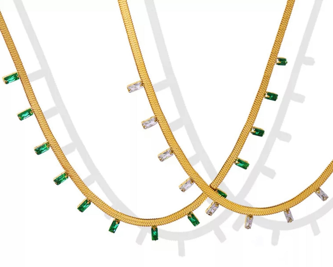 This necklace features a stunning gold-tone chain with an elegant snake-like texture, adorned with clear diamond-like baguette-cut stones. The design is both modern and sophisticated, the clear stones provide a classic sparkle. The stones are evenly spaced along the chain, creating a balanced and luxurious look. This piece is perfect for elevating both everyday outfits and formal attire, making it a versatile addition to any jewelry collection.