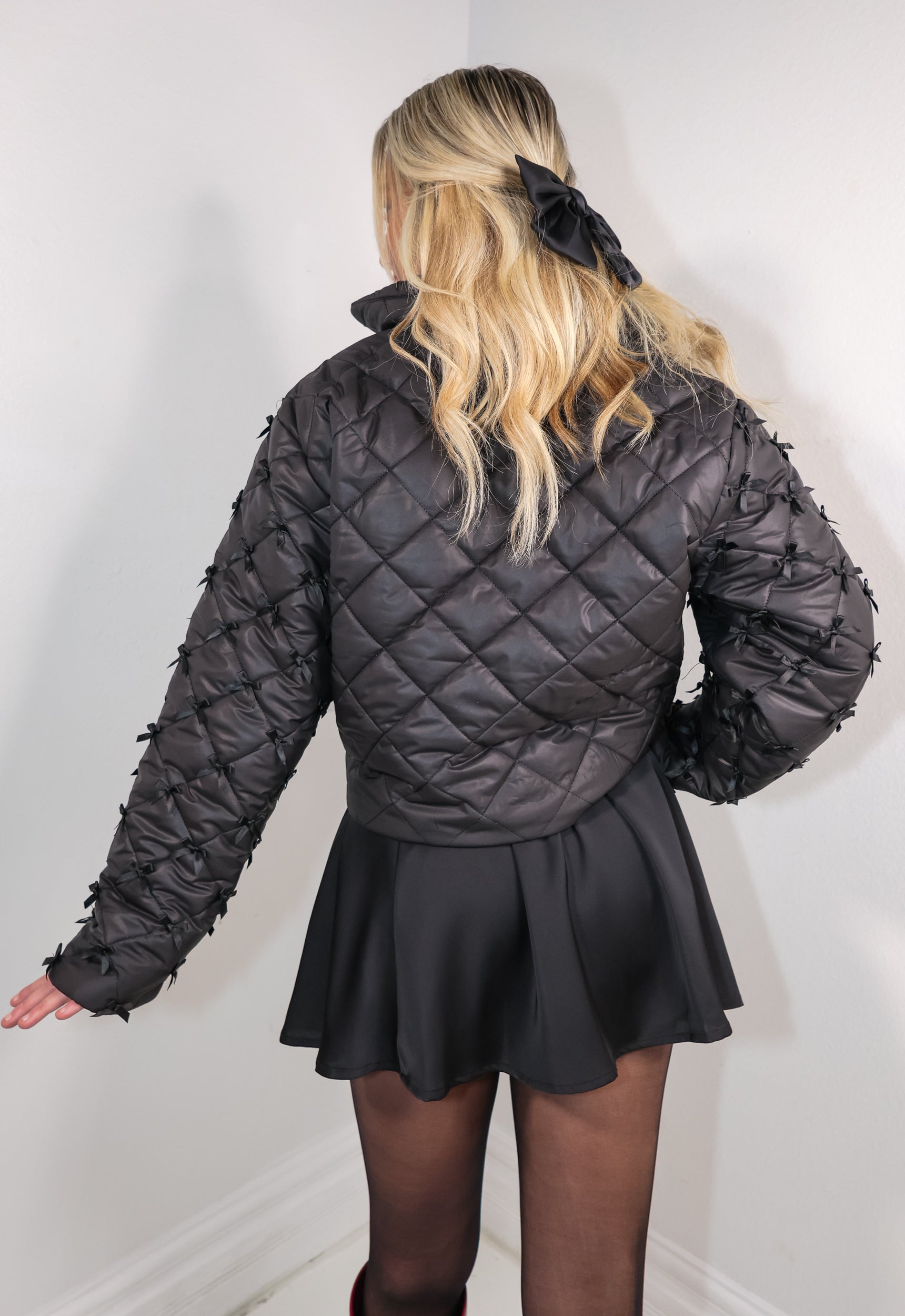 Stay warm and stylish with our Back To Bows Puffer Jacket! This mini black bow adorned jacket features a quilted design and high collar for added warmth. Perfect for the fashion-forward winter lover!