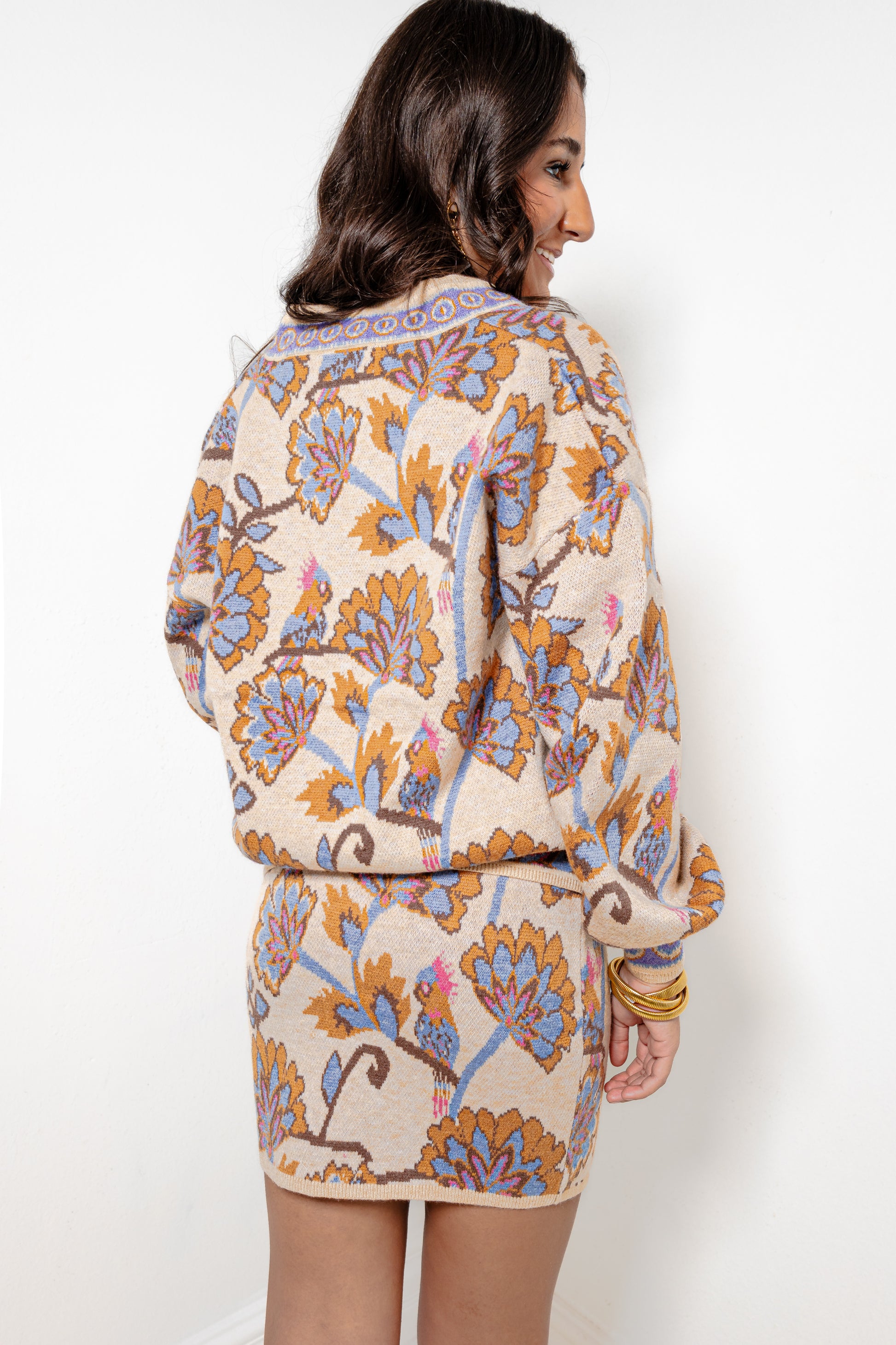 Make a bold statement with this floral jacquard knit mini skirt, designed in warm earthy tones with pops of blue and rust. Crafted from a soft, medium-weight knit, this skirt hugs your curves while keeping you comfortable all day. The high-waisted fit and straight-cut silhouette create a flattering shape that’s easy to dress up or down.