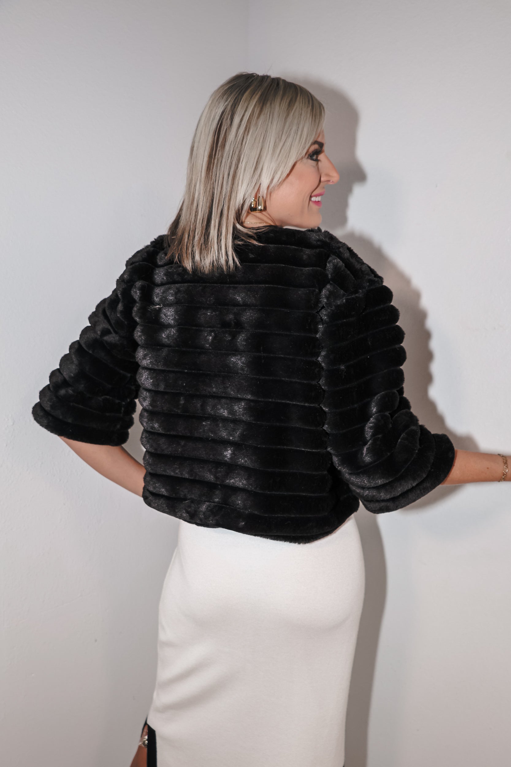 Embrace your edgy side with our Chic Faux Fur Half Sleeve Jacket! Stay warm and stylish with the luxurious faux fur material and modern cropped design. The sleek black color and half sleeves add a touch of sophistication to any outfit. Fashion meets function in this must-have jacket.