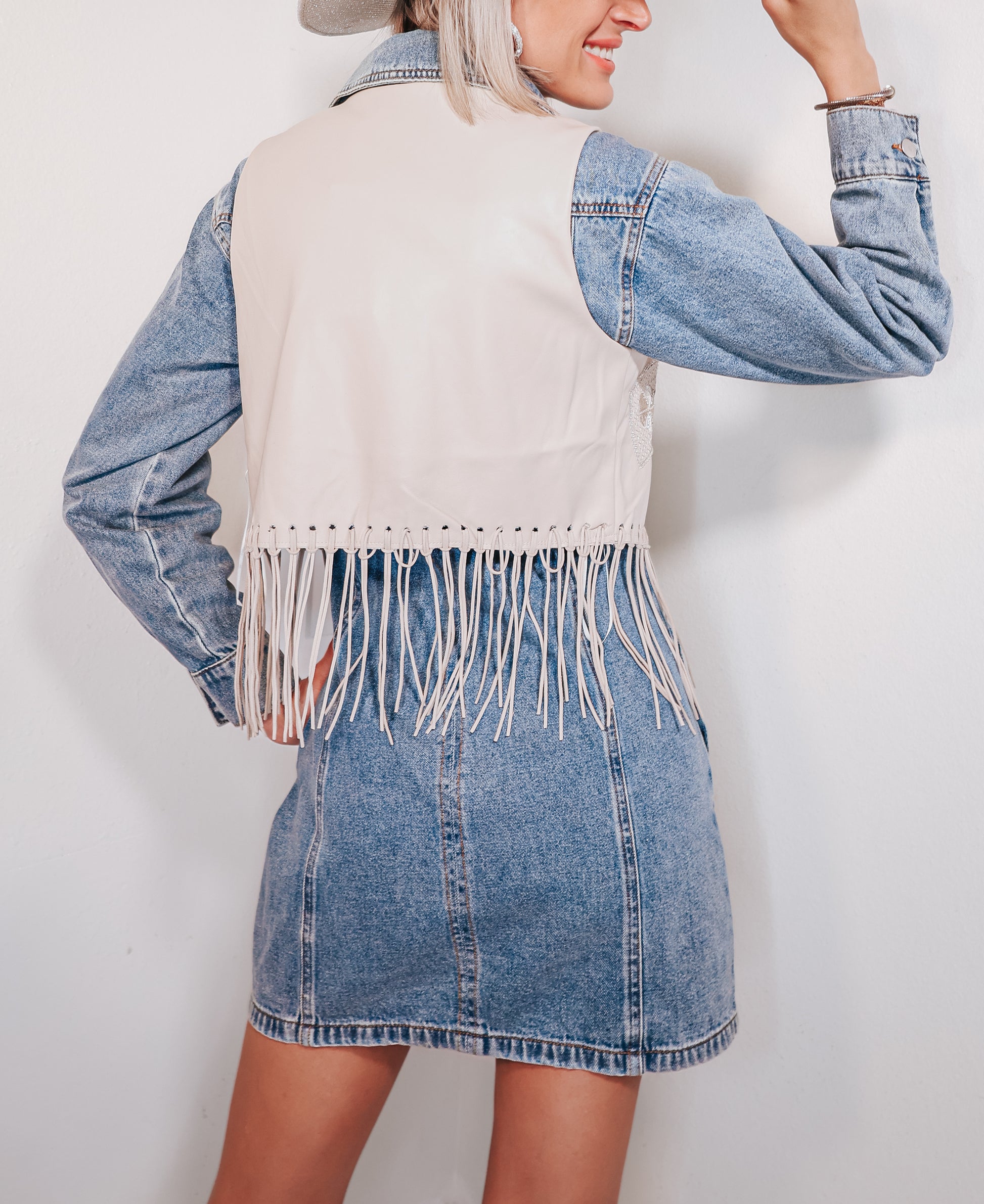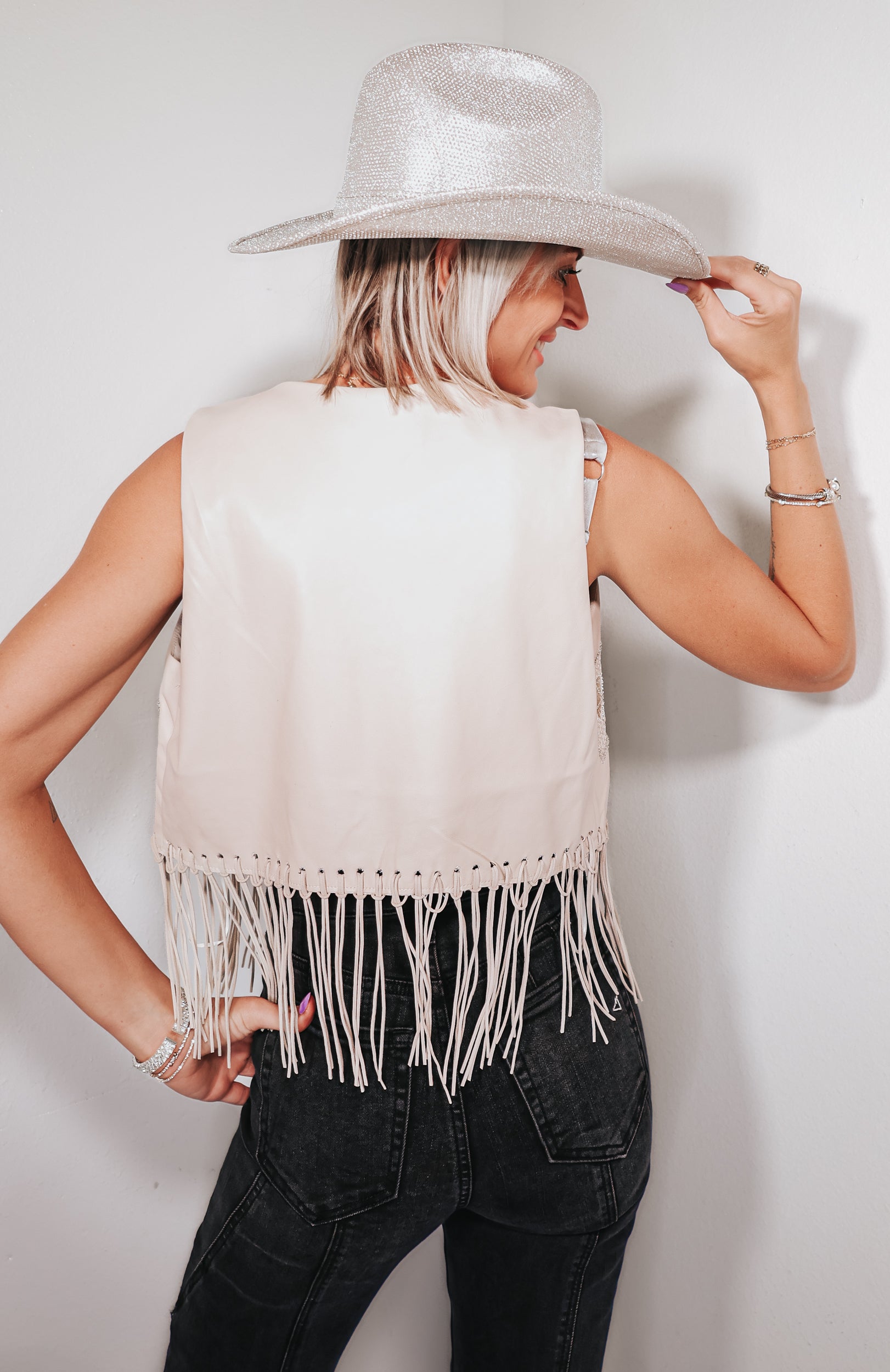 Experience the wild west with our Cosmic Cowgirl Vest. Made with faux leather, this sleeveless vest features fringe accents and stunning beaded artwork. The stone color adds a touch of elegance. A must-have for any cowgirl's wardrobe.