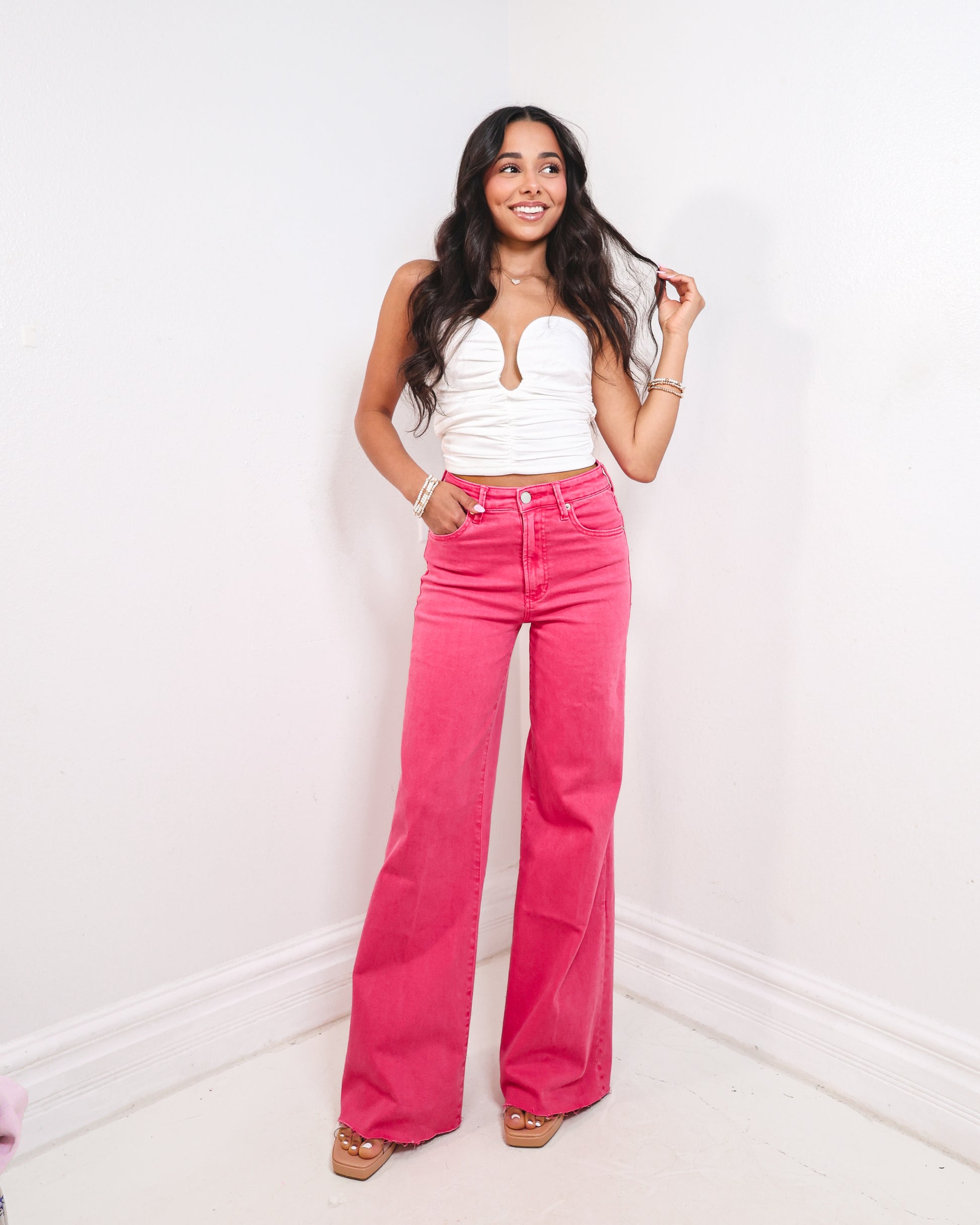 Elevate your denim collection with Dear John Fiona Raspberry High Rise Jeans. Featuring a flattering high rise and wide leg design, these jeans offer timeless style and versatile comfort. The vibrant raspberry denim color adds a pop of color to any outfit. Perfect for fashion-forward individuals seeking a unique and chic look.