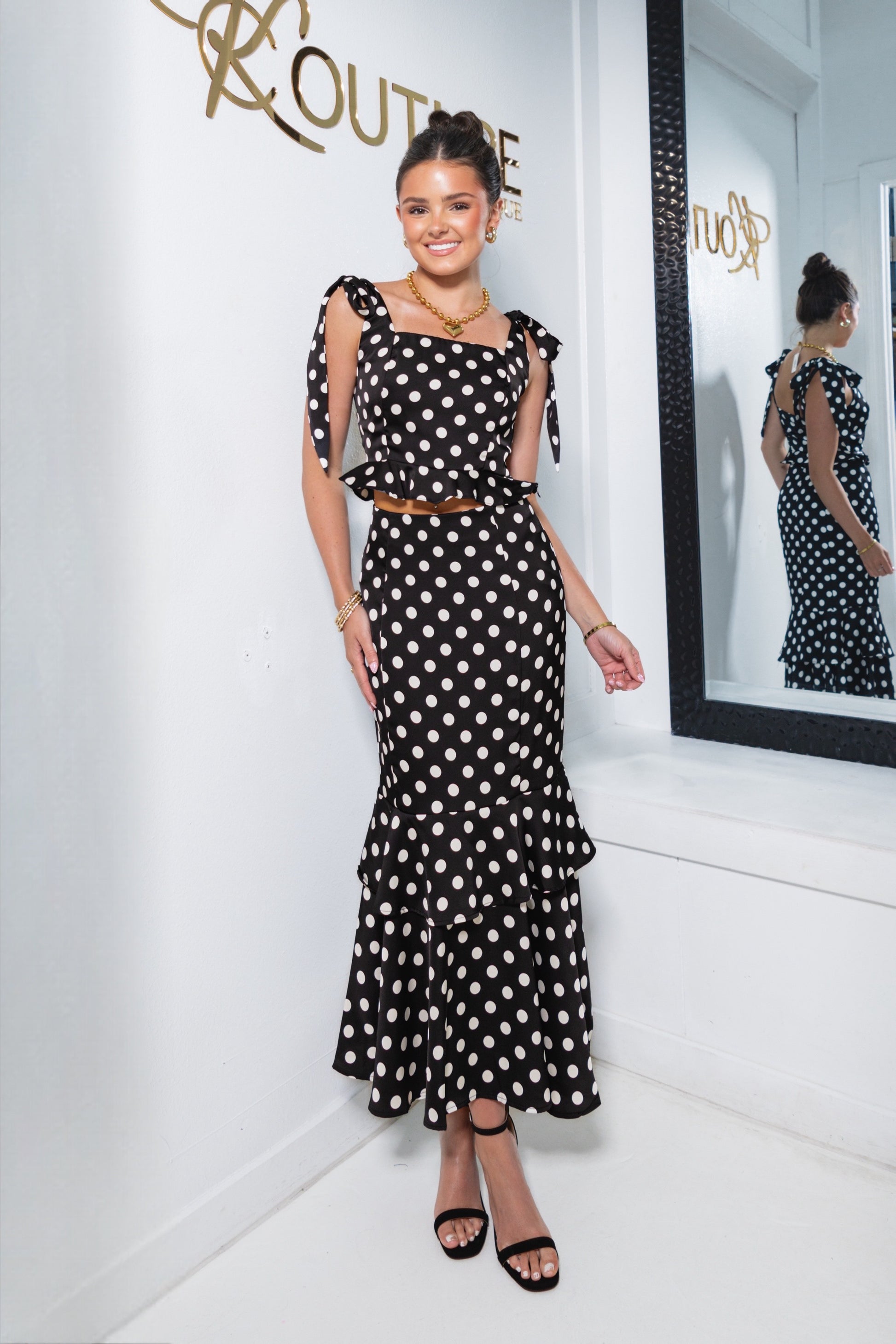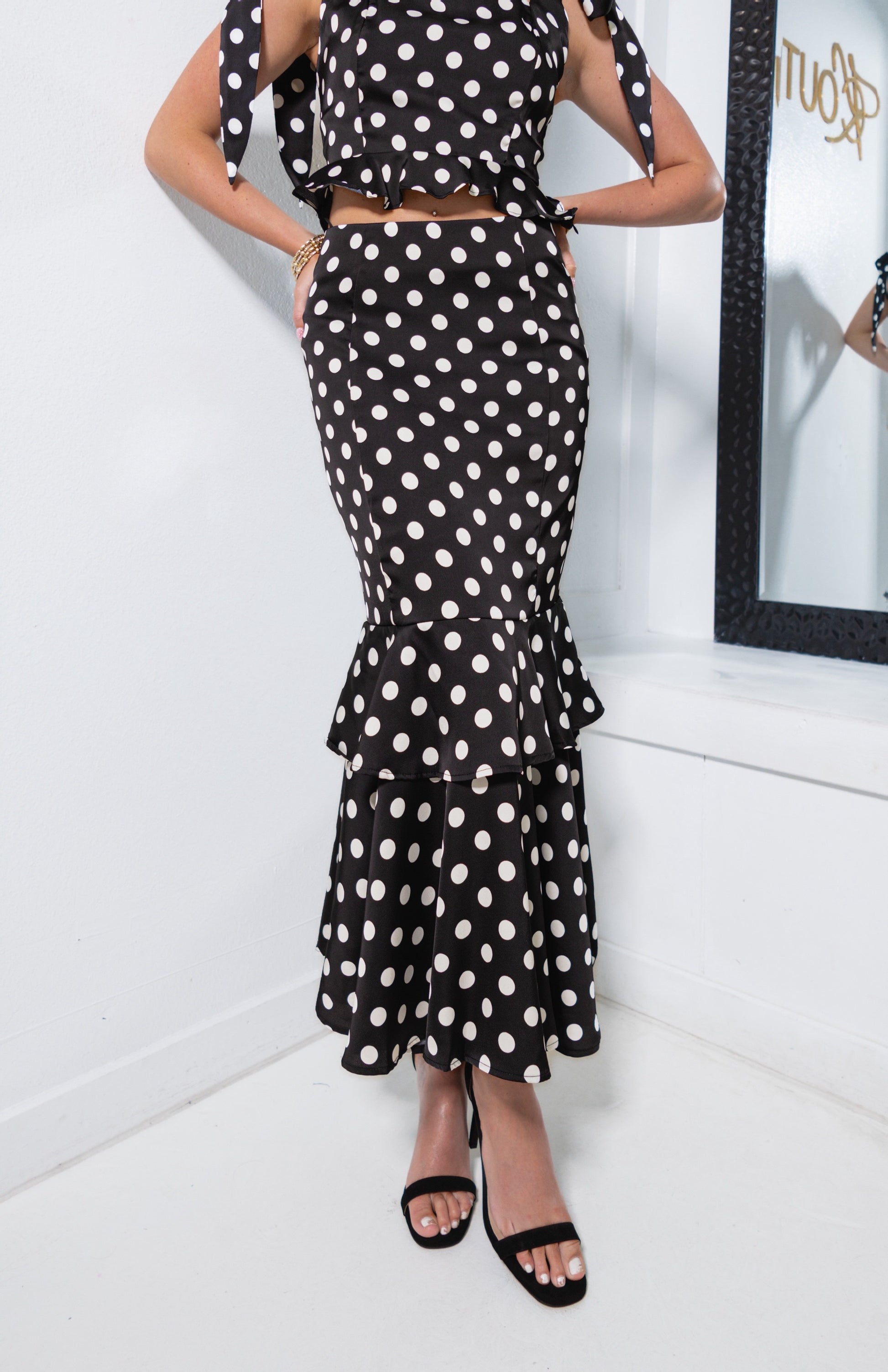 The Dotty On You Ruffled Midi Skirt combines classic charm with modern style. Its high-rise design flatters your silhouette, while the black fabric dotted with white polka dots adds a playful touch. The layered ruffles at the bottom bring movement and elegance, making it perfect for both casual outings and special occasions. Step out confidently in a skirt that’s as versatile as it is stylish.