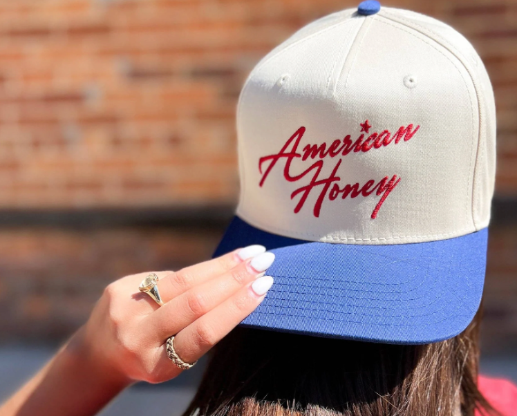 Add a touch of Americana to your outfit with our Embroidered American Honey Trucker Hat! This khaki hat features bold red lettering and a blue bill, perfect for showing off your love for the land of the free and home of the brave. Plus, with its comfortable trucker style, you'll be looking and feeling cool all day long. Order now and show your patriotic pride!