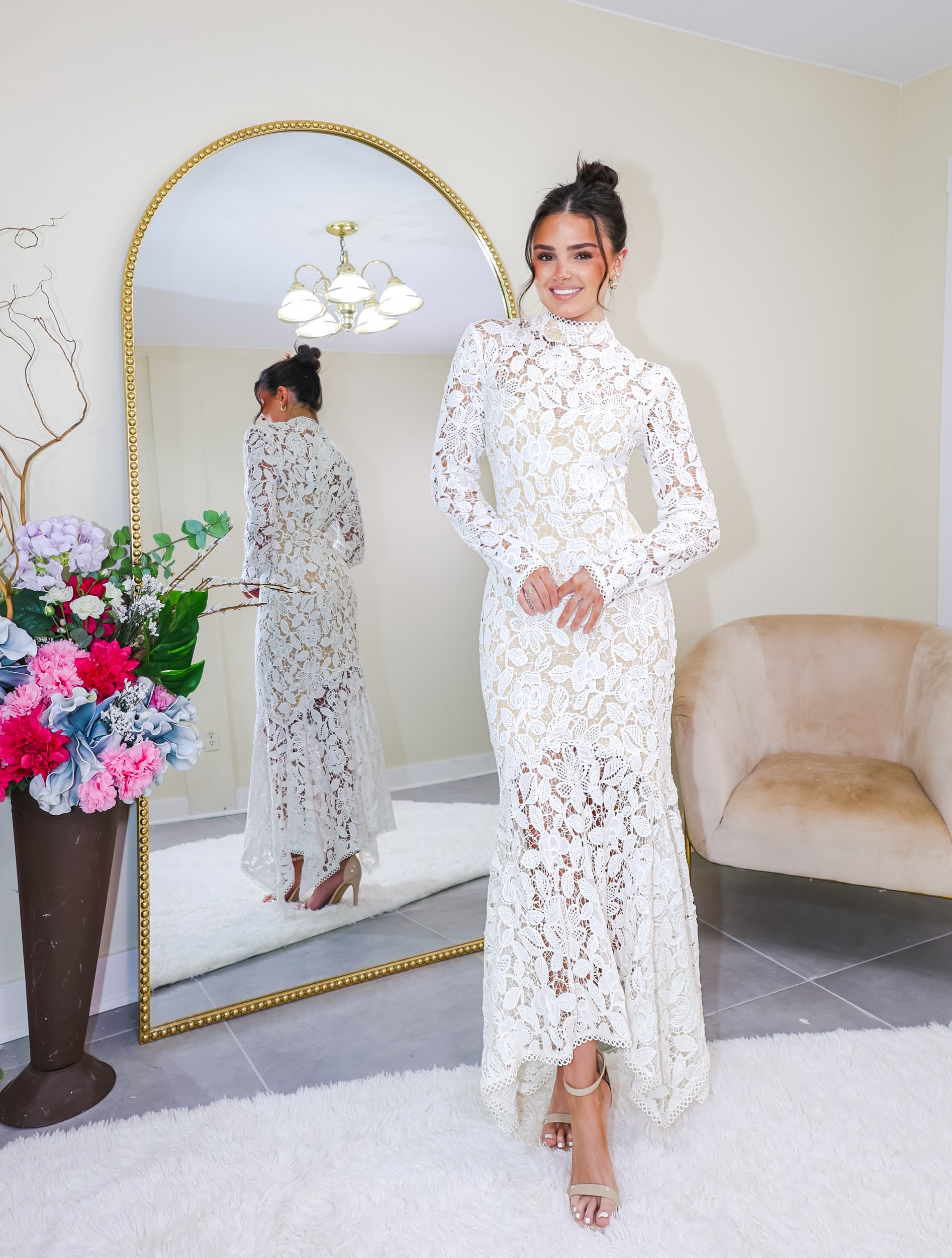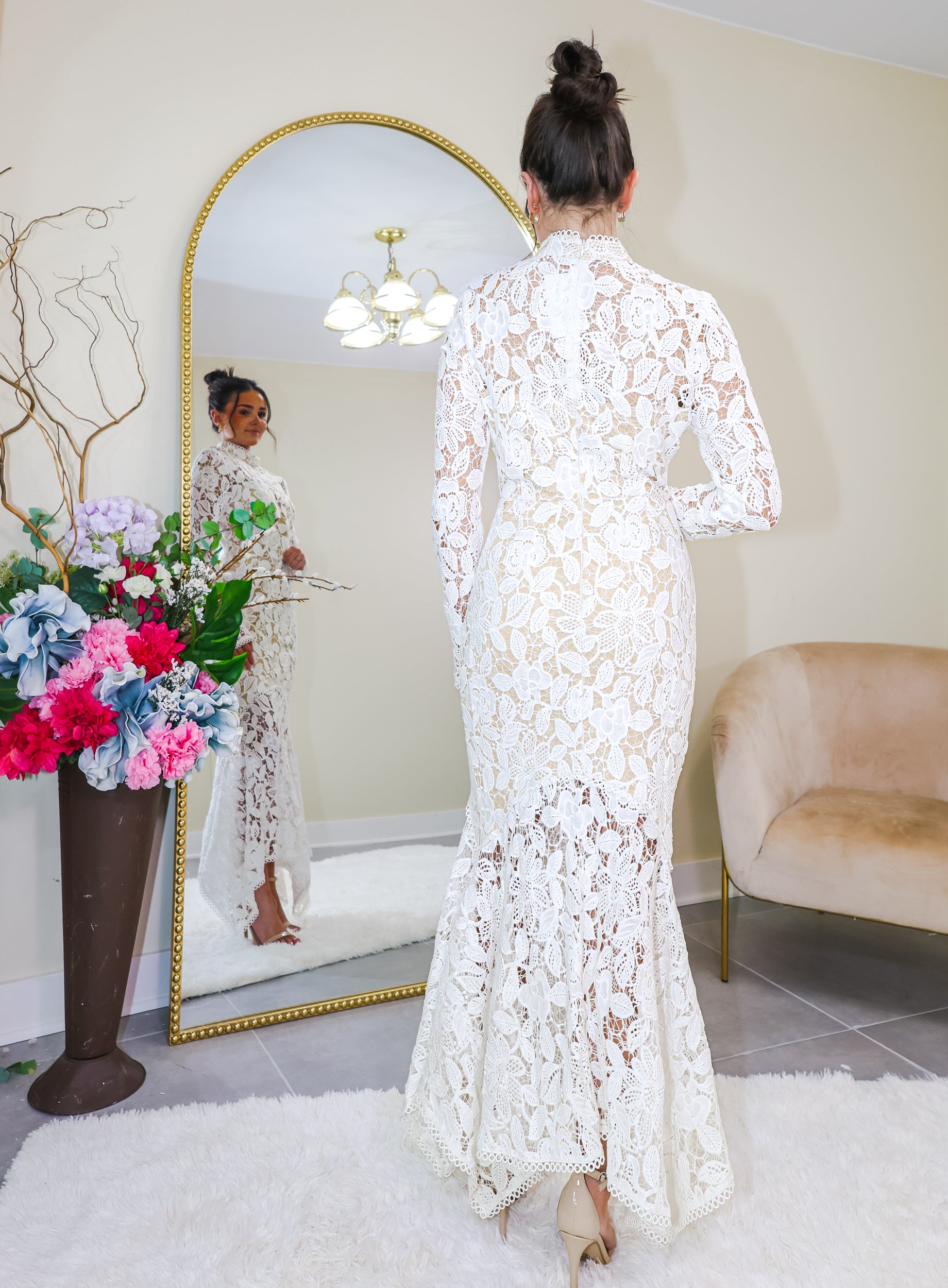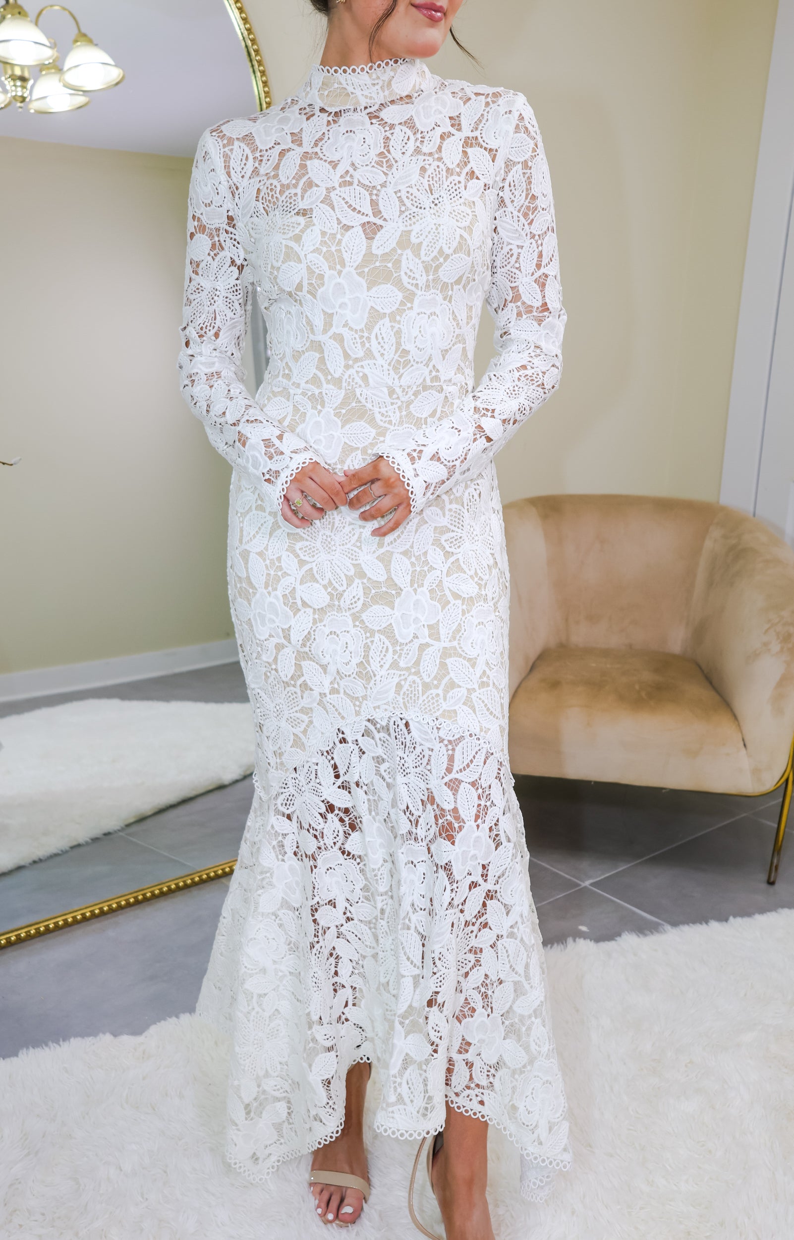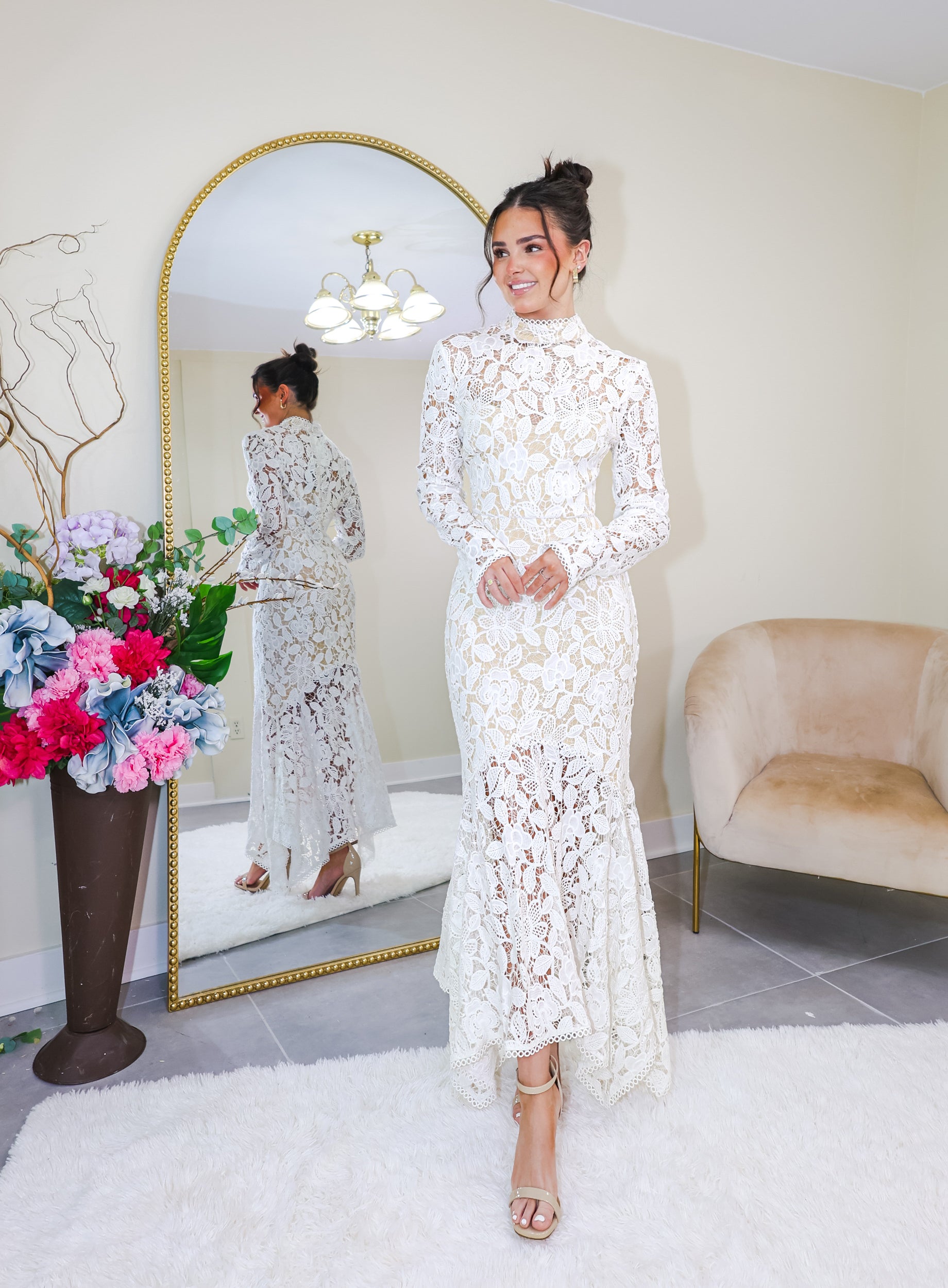 Indulge in elegance with our Ivory Grace Lace Midi Dress. The body-hugging silhouette and floral lace print enhance your figure, while the lined inside, long lace sleeves, and mock neckline add sophistication. The ruffle fishtail hem adds a touch of drama. Be the epitome of grace and style in this midi dress.