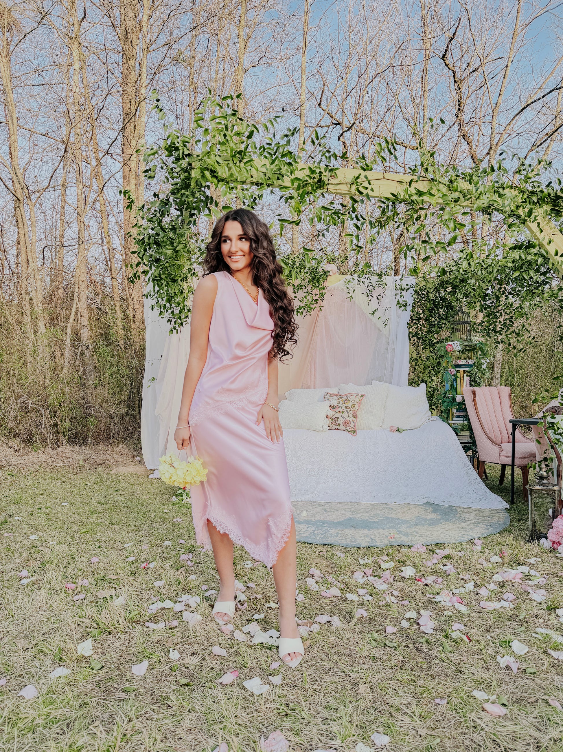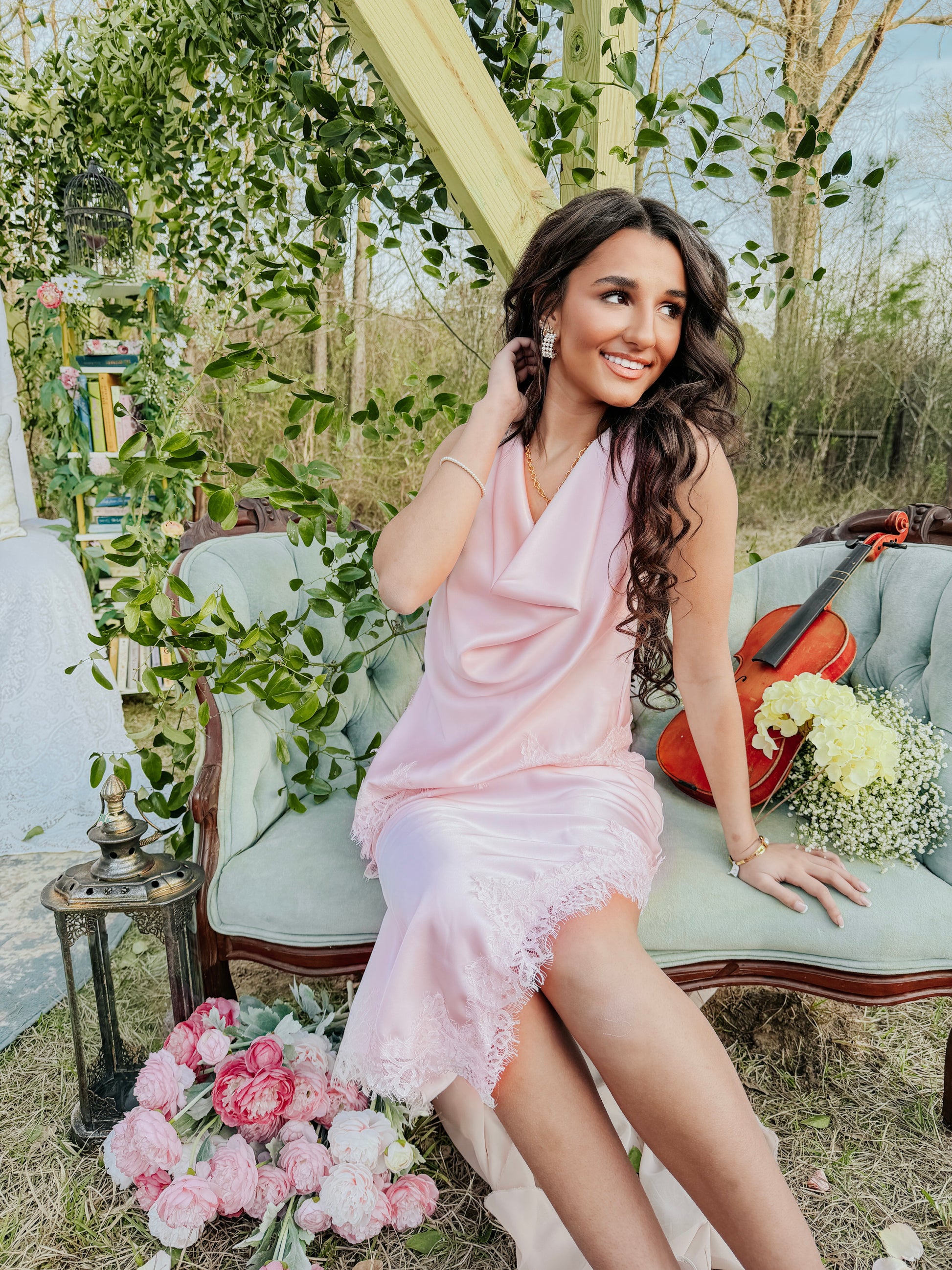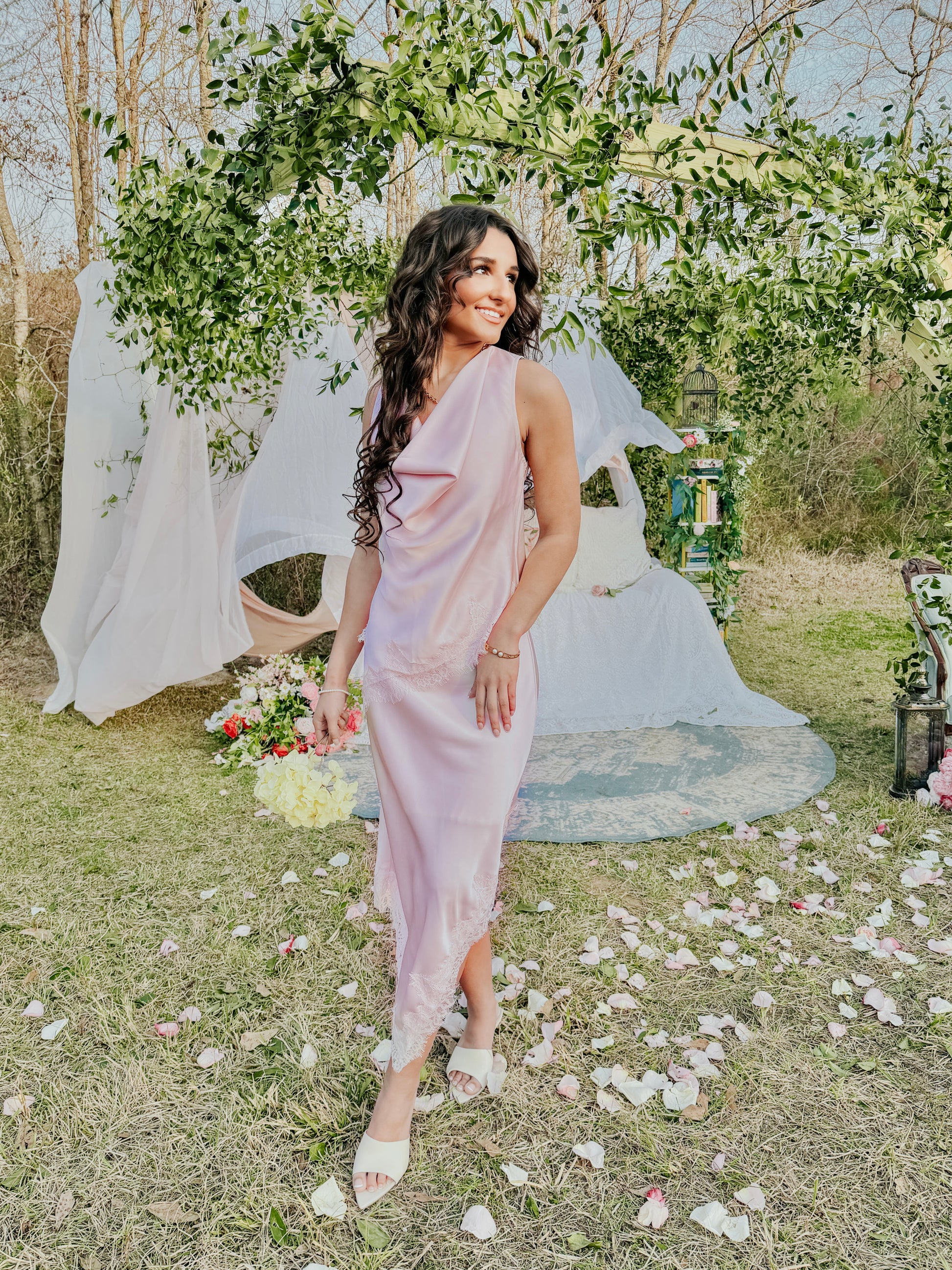 Graceful, fluid, and effortlessly romantic — the Lace & Light Drape Skirt is designed to move with you. Featuring a soft satin-like finish and an elegant asymmetrical pointed hem, this skirt is finished with delicate lace trim that adds just the right touch of femininity. The lightweight fabric drapes beautifully, creating soft movement and a flattering silhouette from every angle.
