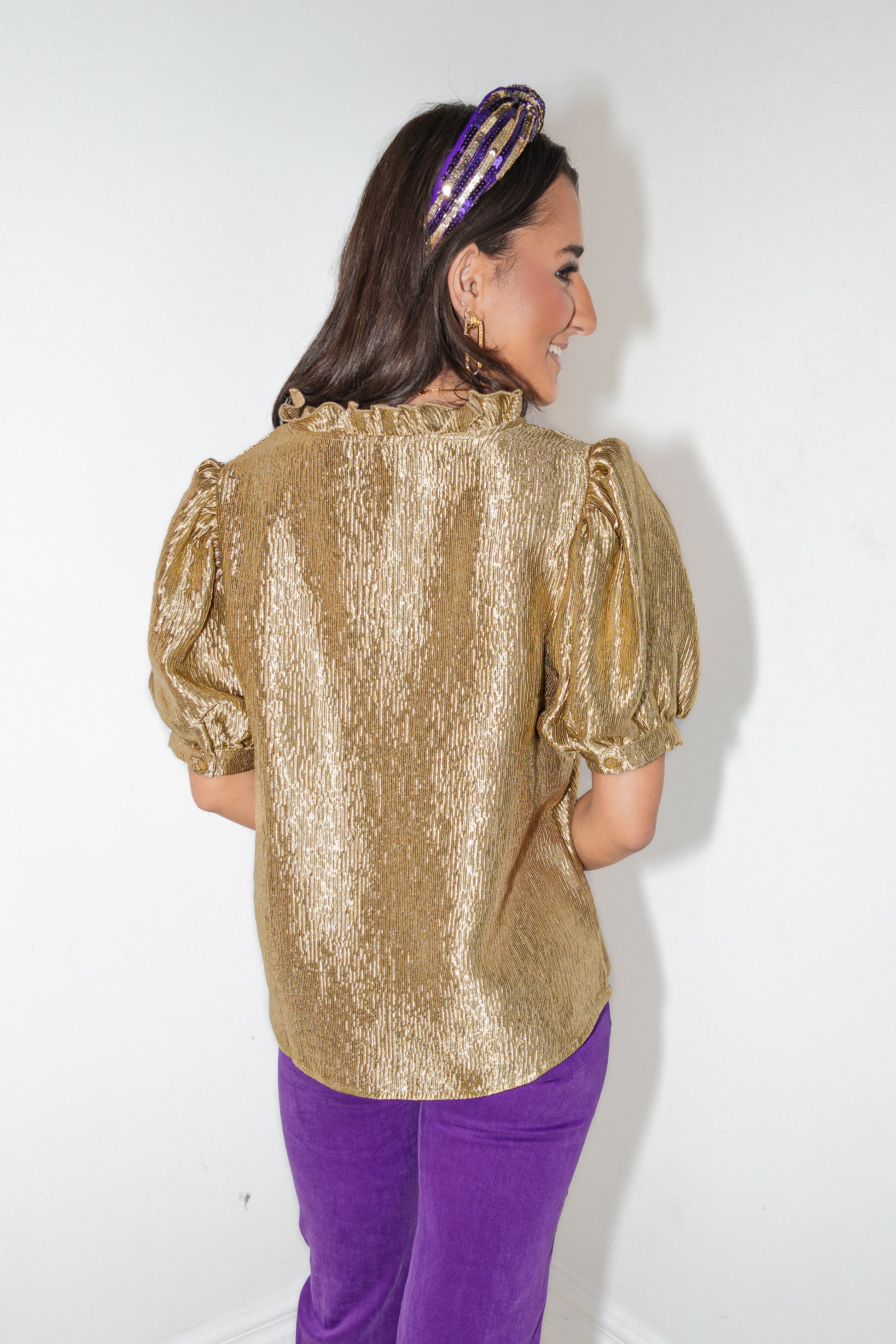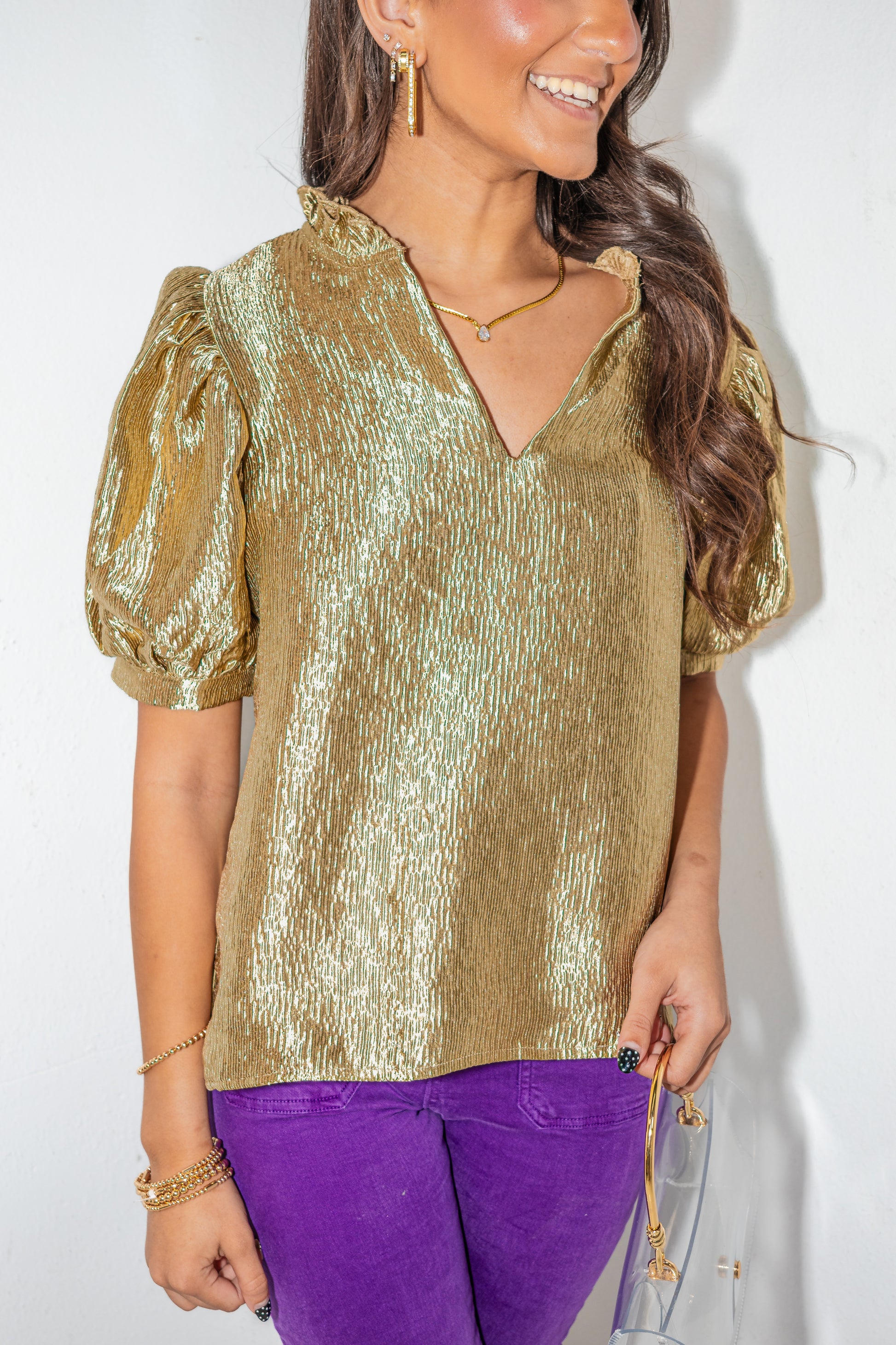 Make a glowing entrance in the Luminous Luxe Puff Sleeve Top — a radiant statement piece designed to turn heads. Crafted from a liquid-gold metallic fabric, this top balances glamour with timeless sophistication. The structured puff sleeves and subtle v-neckline create a flattering, feminine silhouette that’s perfect for everything from holiday dinners to nights out with the girls.