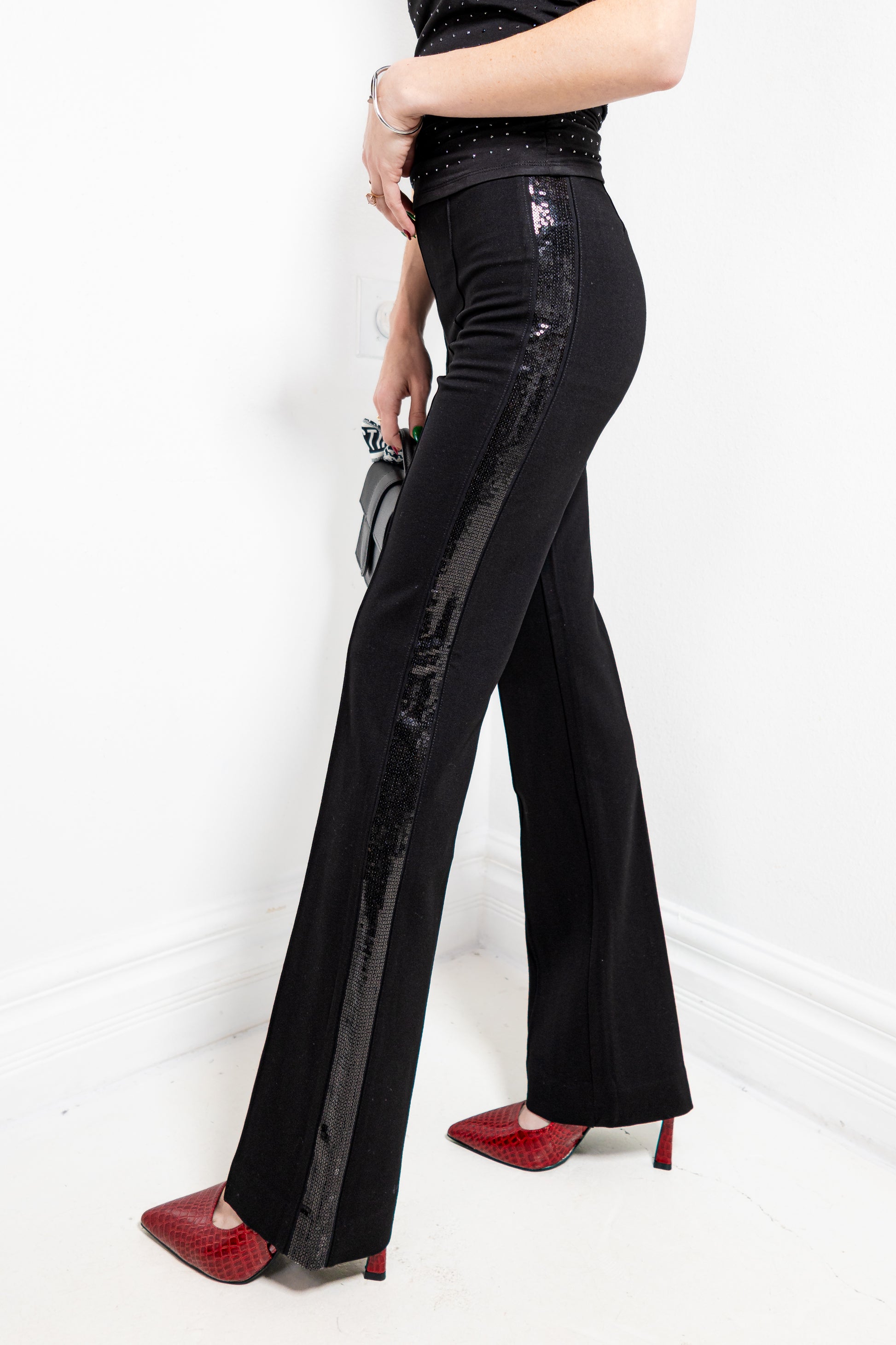 Elevate your look with these sequin side panel slim pants, where classic tailoring meets subtle sparkle. Designed with a sleek, figure-flattering silhouette, these pants feature black sequin detailing along the outer leg for just the right touch of shimmer.