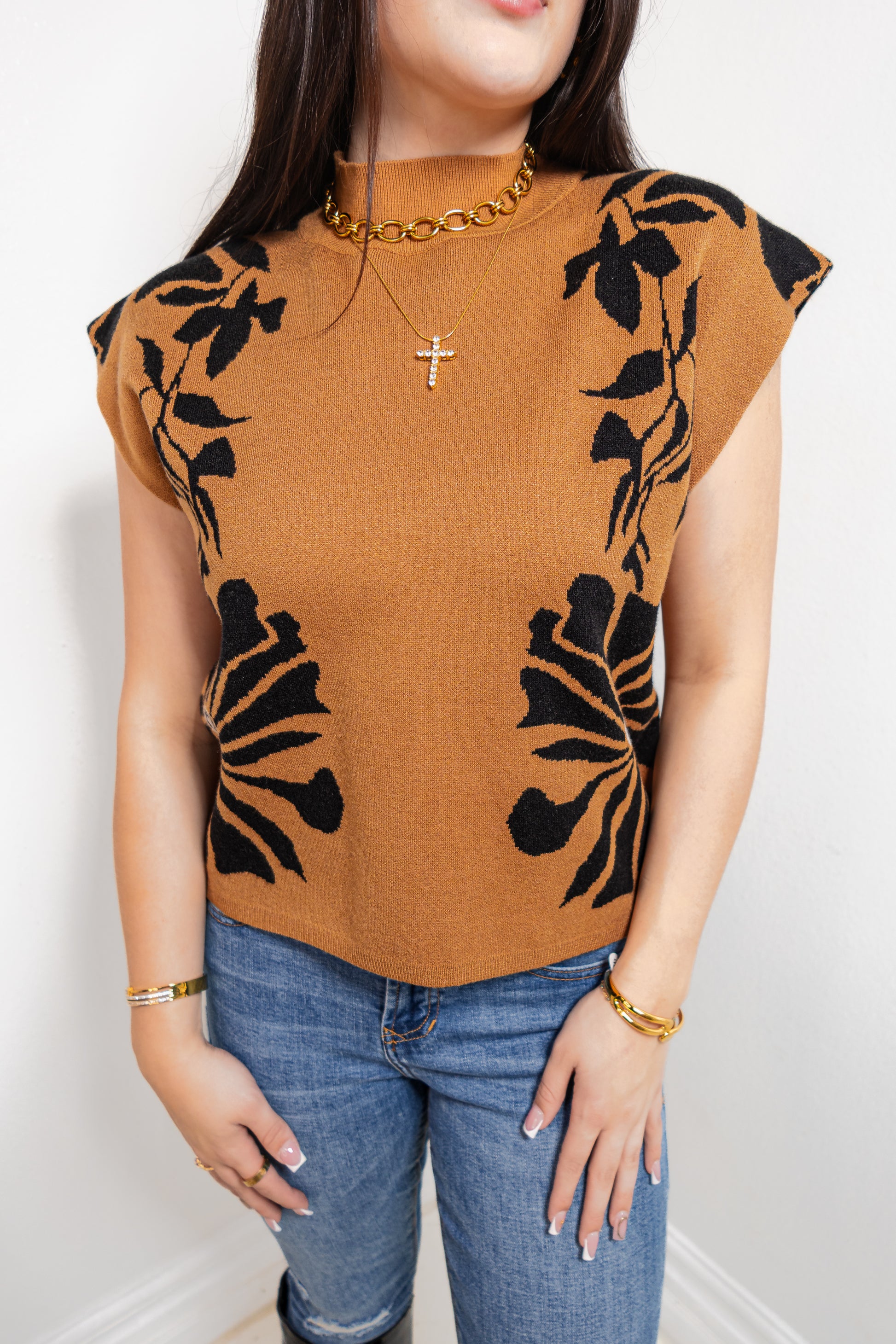 Bring bold elegance to your wardrobe with this sleeveless knit top, featuring a warm golden hue adorned with striking black floral motifs. Designed with a mock neck and structured shoulders, this piece combines modern sophistication with artistic flair. Perfect for layering or wearing on its own, it transitions effortlessly from day to night. Pair it with tailored trousers for a polished office look or high-waisted jeans for chic weekend style.