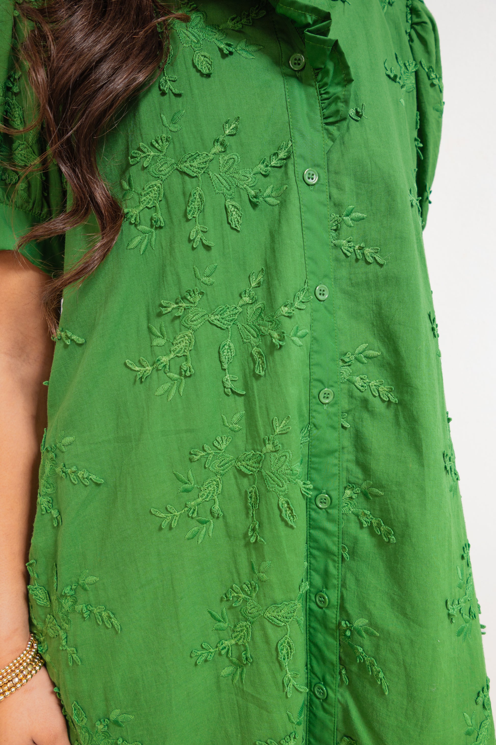 Fresh, feminine, and effortlessly chic—this green button-down mini dress is a must-have for every season. Designed with short puff sleeves, delicate tonal embroidery, and a relaxed silhouette, it strikes the perfect balance between playful charm and everyday comfort. The collared neckline with subtle ruffle trim adds a touch of sophistication, while side pockets bring a practical, laid-back vibe.