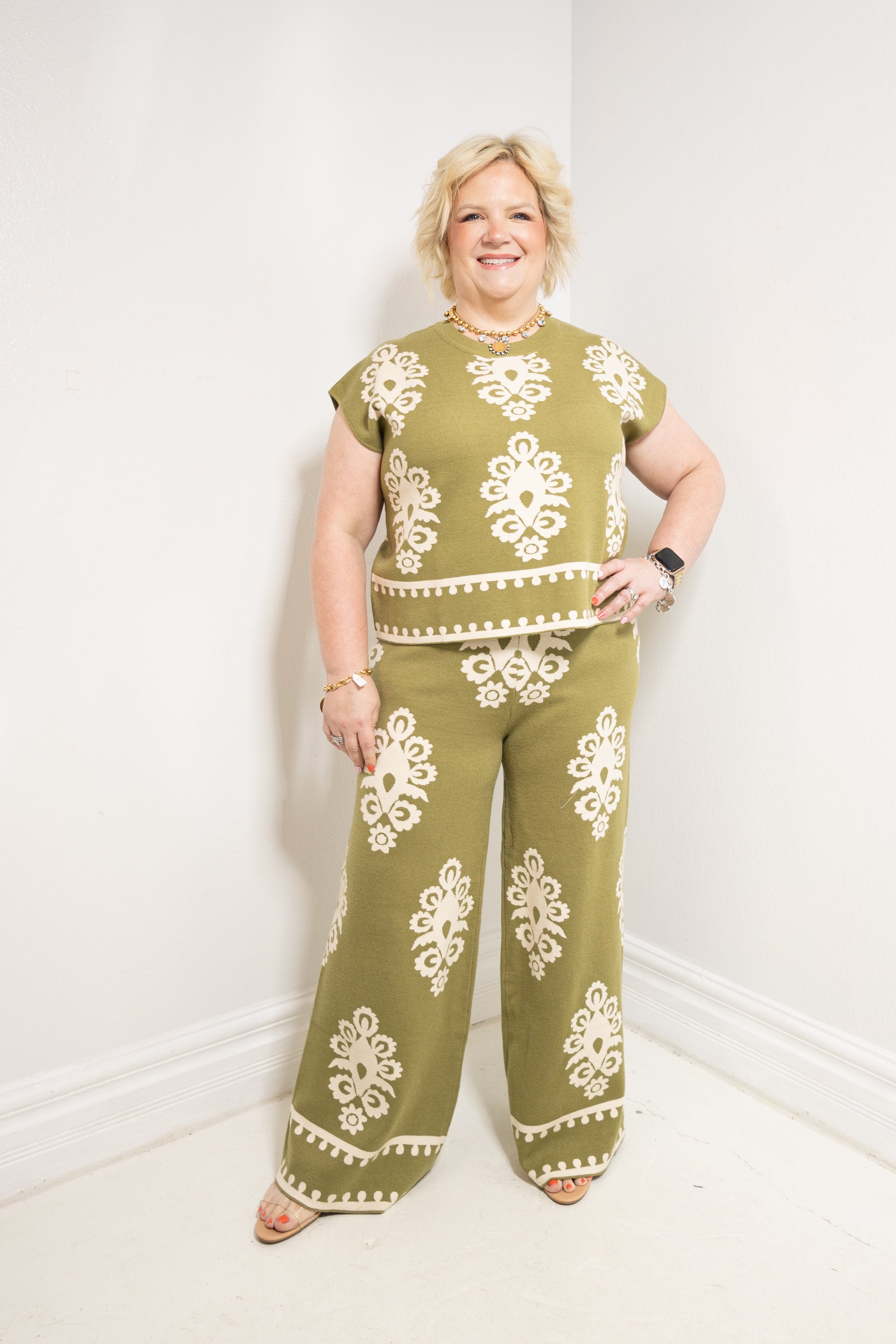 Transport your wardrobe to a faraway destination with the Moroccan Muse Sweater Top. Featuring an intricate woven medallion print and a rich olive hue, this luxe knit feels like a cozy passport to effortless chic. Whether paired with the matching pants or styled solo, this top turns heads while keeping you comfy.
