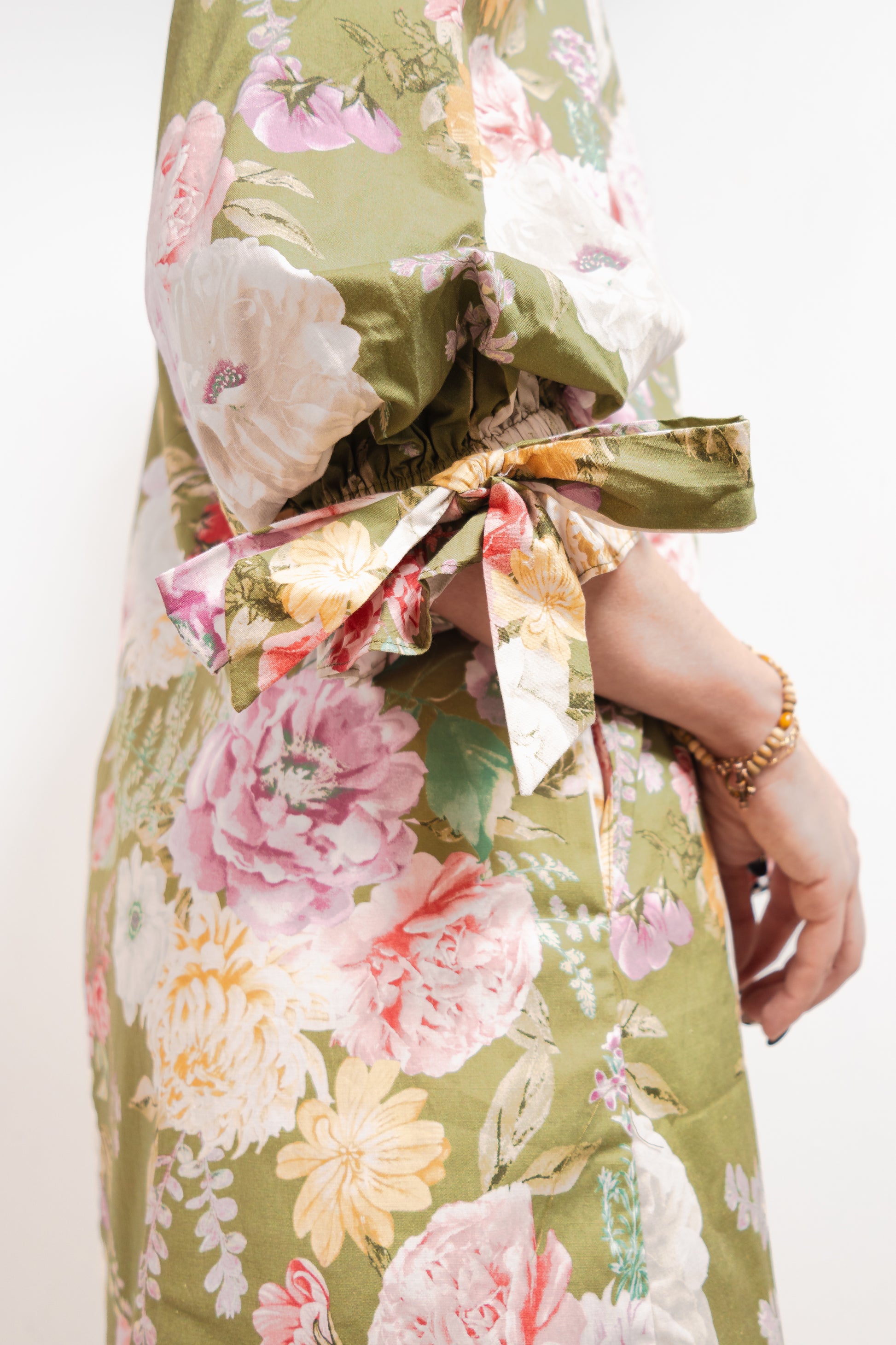 Fresh, feminine, and effortlessly chic — this floral mini dress is a timeless wardrobe staple. Designed with an olive green base, it features a romantic allover floral print in soft pinks, whites, and yellows that add a touch of charm. The dress is cut in a relaxed shift silhouette with long sleeves that gather at the cuffs, finished with tie accents for a delicate detail. A subtle ruffled neckline with a split V adds elegance, while side pockets bring a touch of modern practicality.