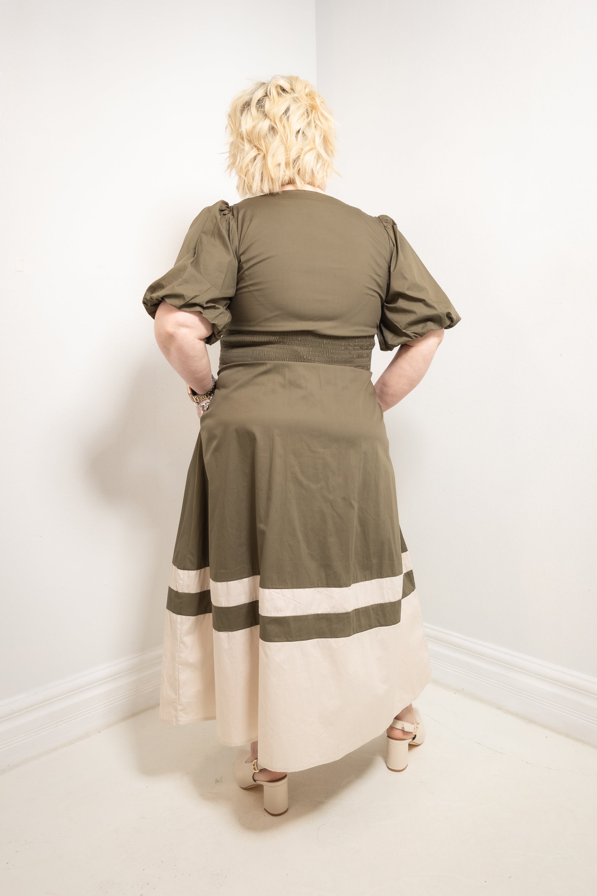 Olive Grove Puff Sleeve Colorblock Midi Dress