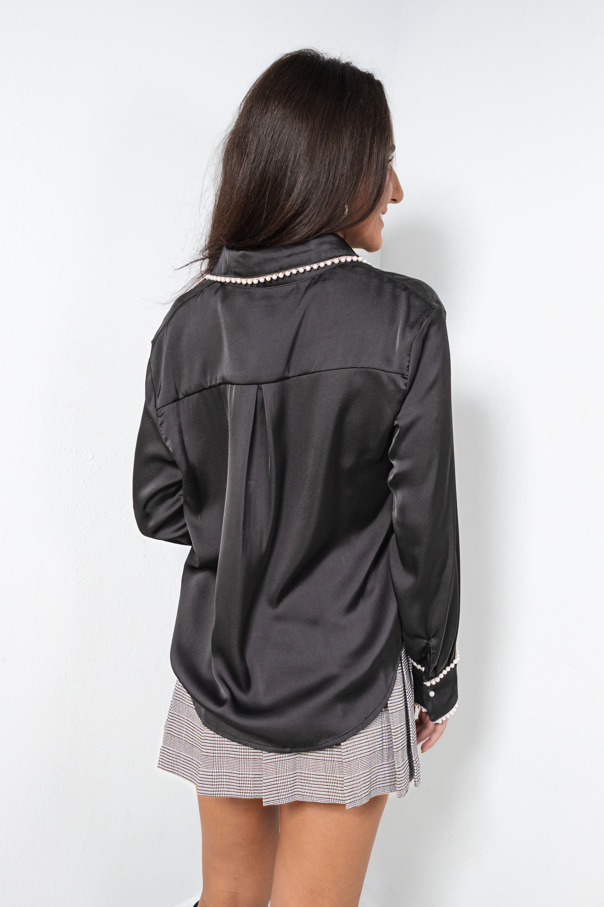 Elevate your wardrobe with the Pearl Luxe Satin Blouse, a timeless piece that exudes elegance in every detail. Crafted from silky satin fabric, this blouse features delicate pearl trim along the collar and cuffs for a refined, feminine finish. Its relaxed yet polished silhouette makes it easy to dress up or down — perfect for pairing with tailored trousers, a chic mini skirt, or your favorite denim.