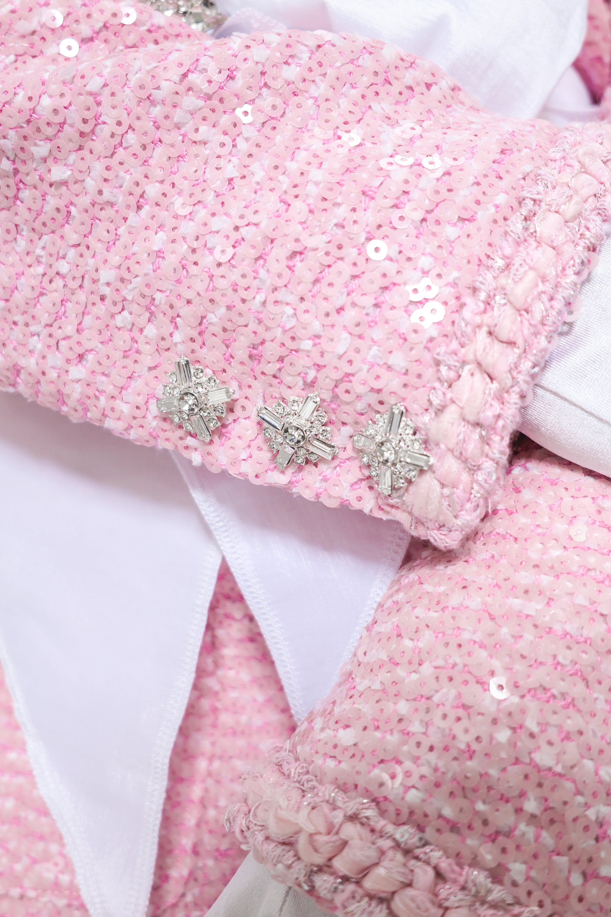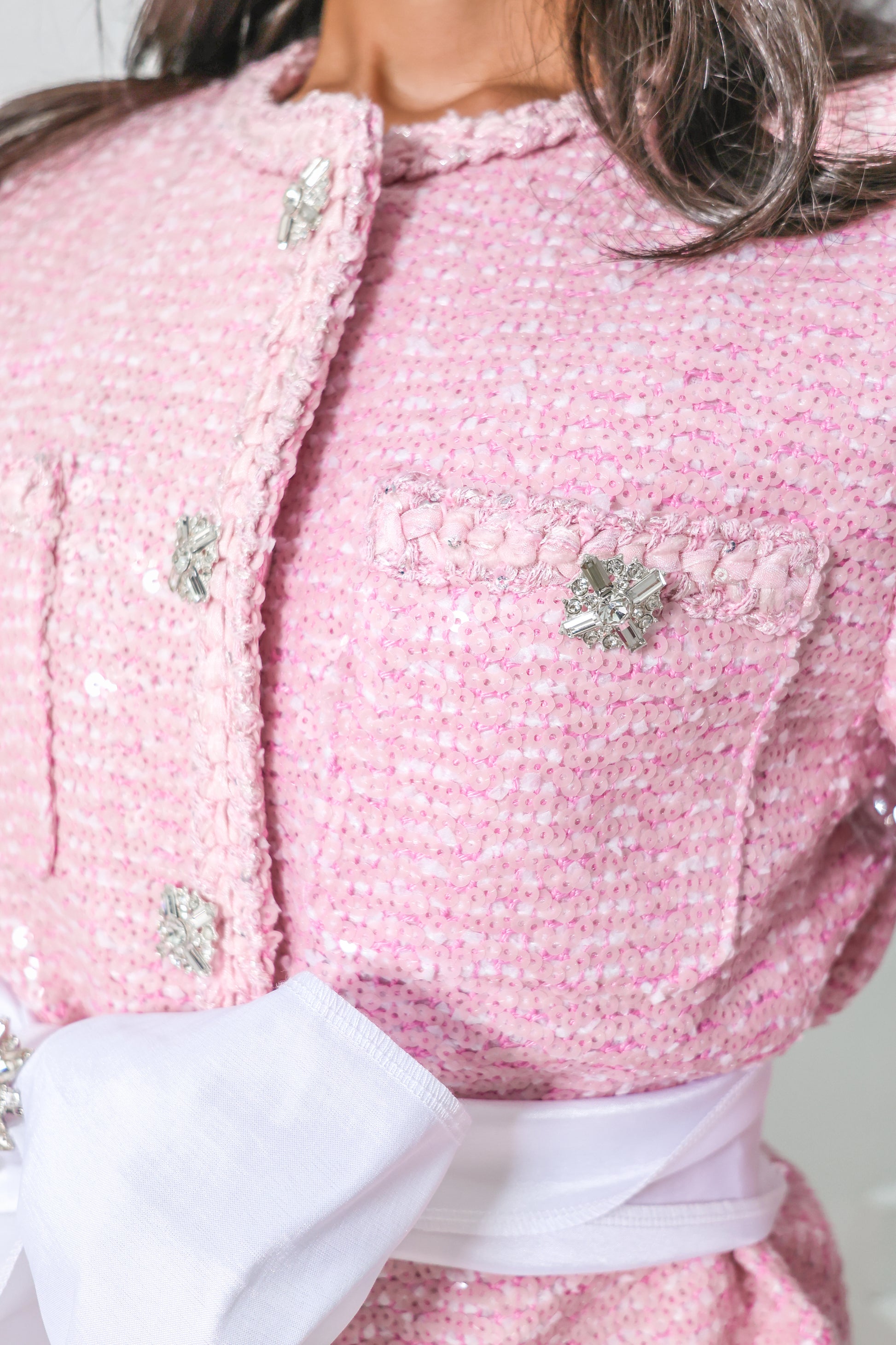 This high-rise mini skirt dazzles with all-over pink sequins and exquisite rhinestone embellishments. The luxurious tweed fabric adds texture and sophistication to this eye-catching piece. Perfect for making a statement at special events or adding glamour to your evening wardrobe.