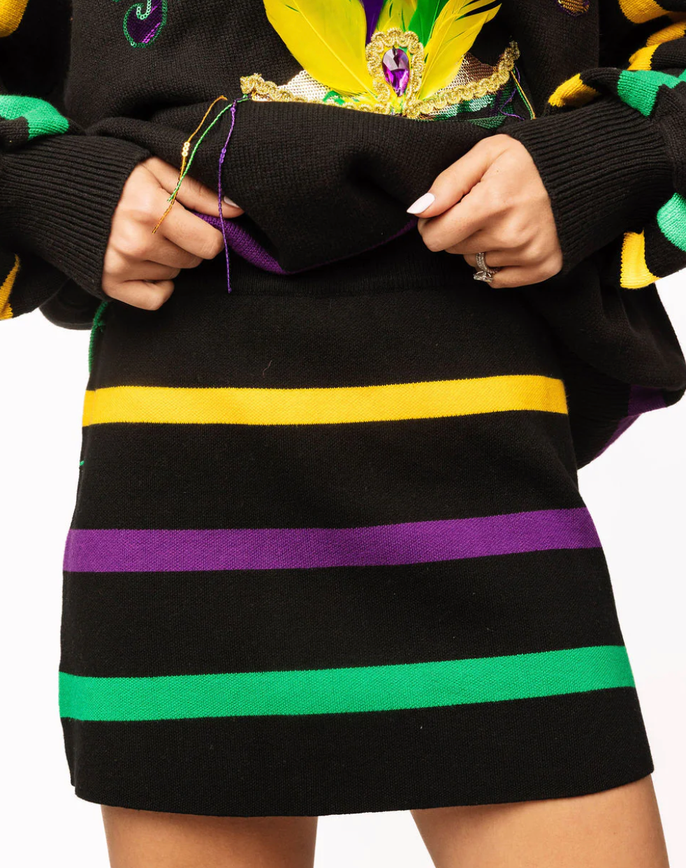 This skirt brings the party with every step. Designed in a bold black/lavender base with vibrant purple, green, and gold horizontal stripes, it’s a playful nod to Mardi Gras energy with a chic, wearable edge. The soft knit fabric hugs just right while keeping things comfortable, making it perfect for all-day wear or a night out. Pair it with the matching sweater for a statement set, or style it with a simple tee or fitted top to let the colors shine. Fun, flattering, and full of personality—this skirt was made to stand out.