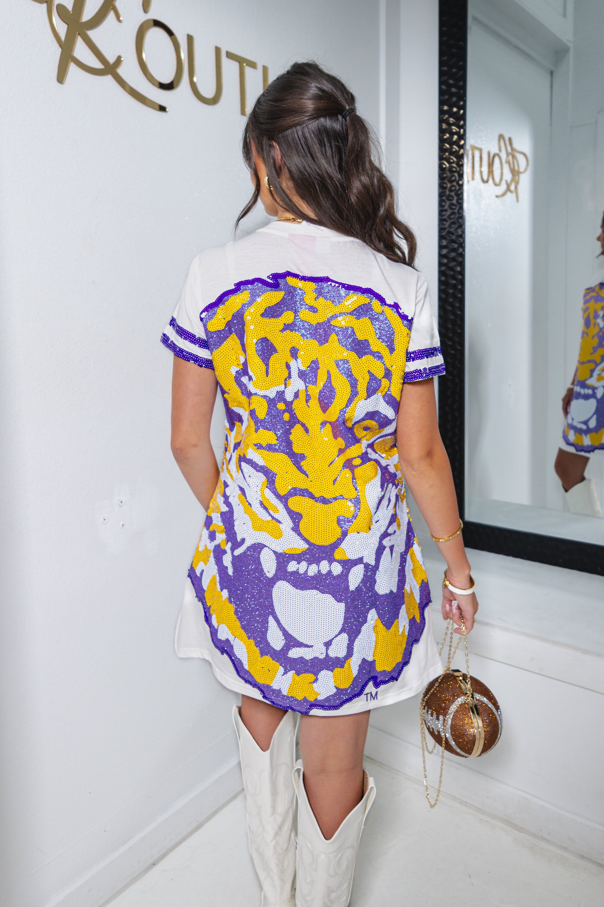 Show your tiger pride with a side of sparkle in the Queen of Sparkles Licensed LSU Mascot Tee Dress. Designed for game days that deserve a roar, this dazzling piece turns the classic tee dress into a total showstopper. With its fully sequined LSU tiger mascot graphic in bold purple and gold, you’ll be the star of the stadium (or any tailgate). Effortlessly cool, comfortable, and spirited, this dress is the ultimate blend of sports-fan energy and fashion-girl vibes.
