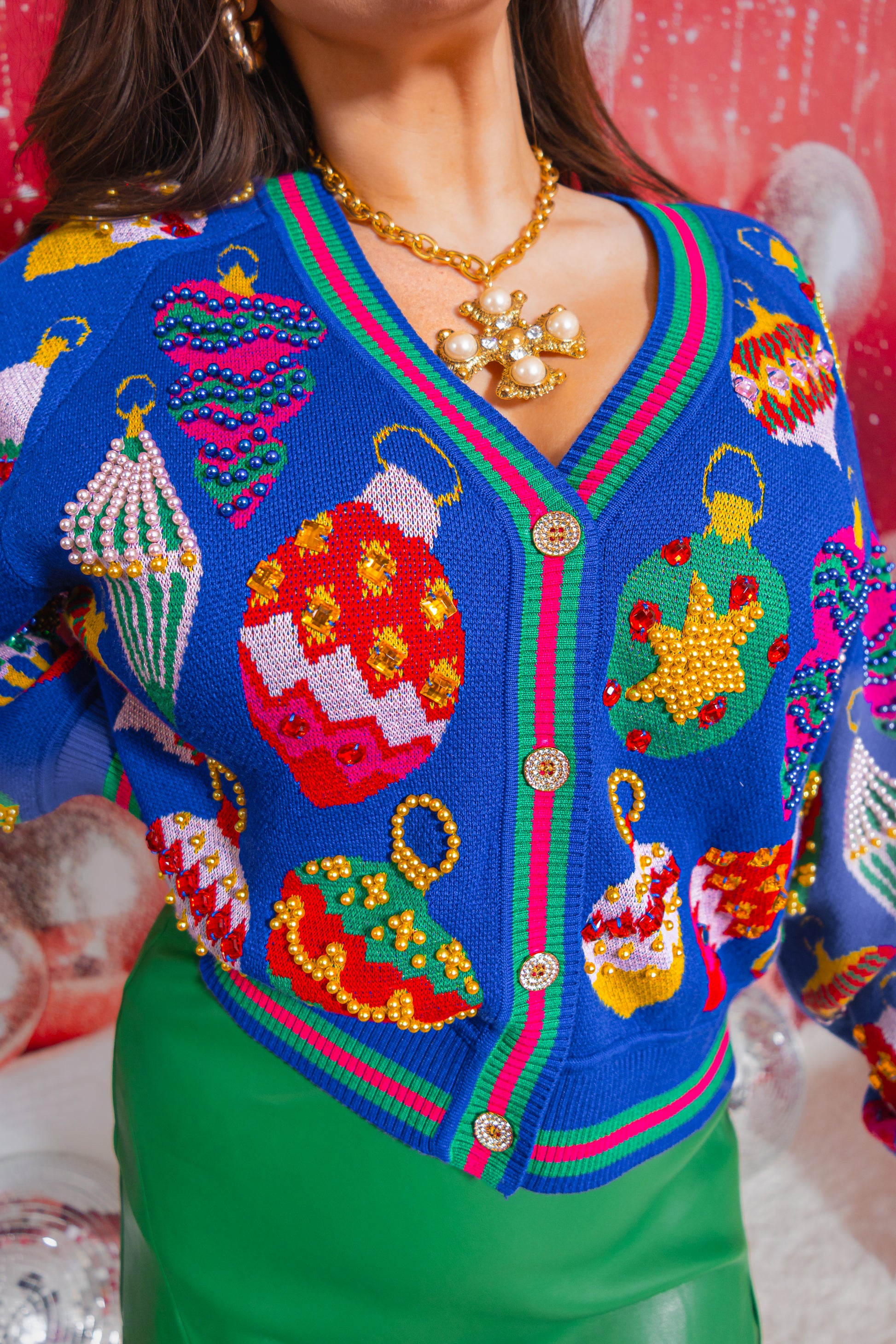 Add a festive pop to your holiday wardrobe with this playful royal blue cardigan! Adorned with vibrant, colorful Christmas ornaments on both front and back, it’s perfect for spreading cheer. Button it up and pair with the matching skirt or pants to complete your merry, stylish look for any seasonal celebration.