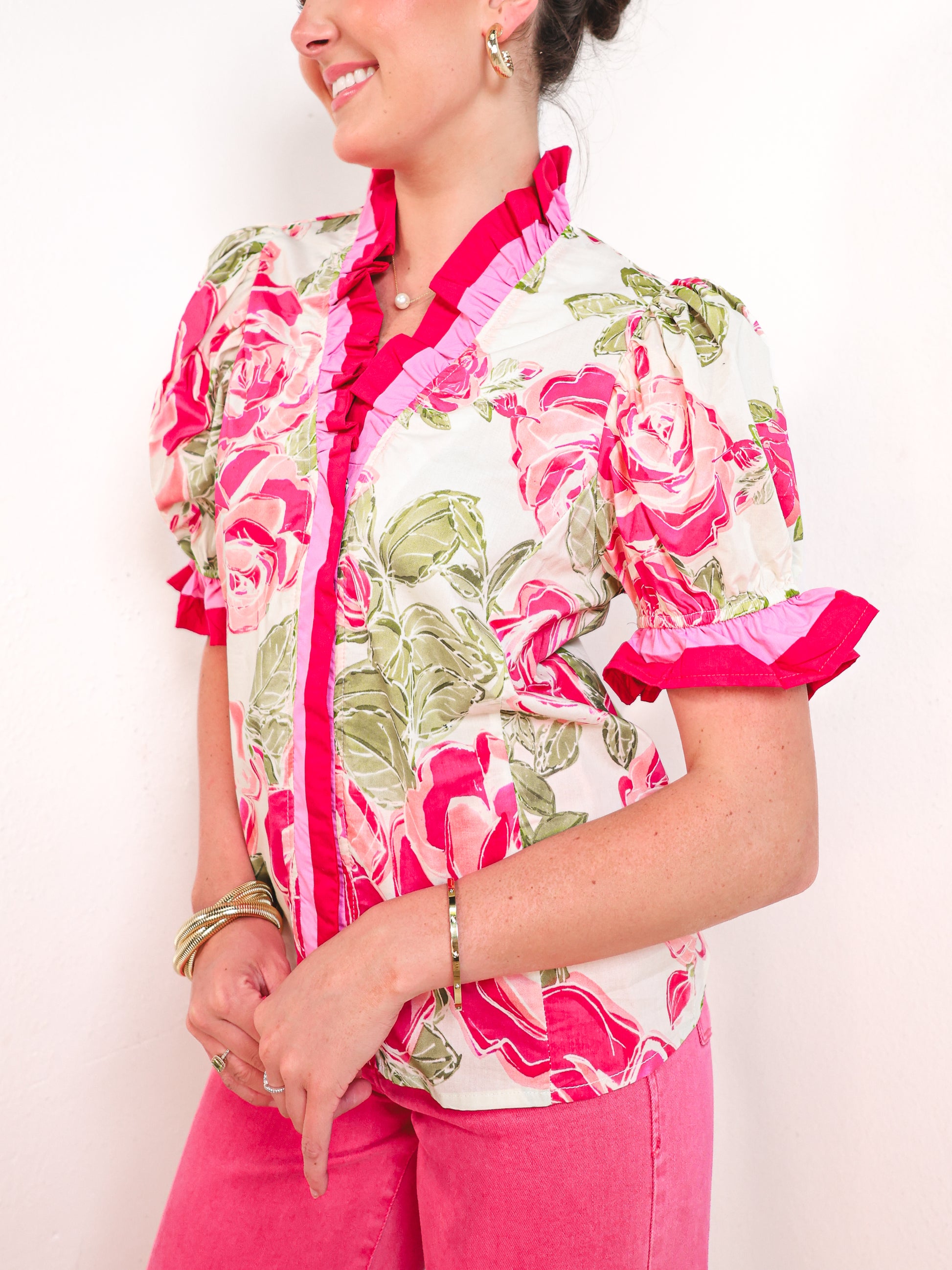 An expertly crafted Rose Revival V-Neck Top that features a gorgeous floral pattern in cream, red, and pink. The delicate ruffled collar and half sleeves add a touch of femininity while the v neck and hidden button down in front provide both style and ease. Perfect for any occasion.