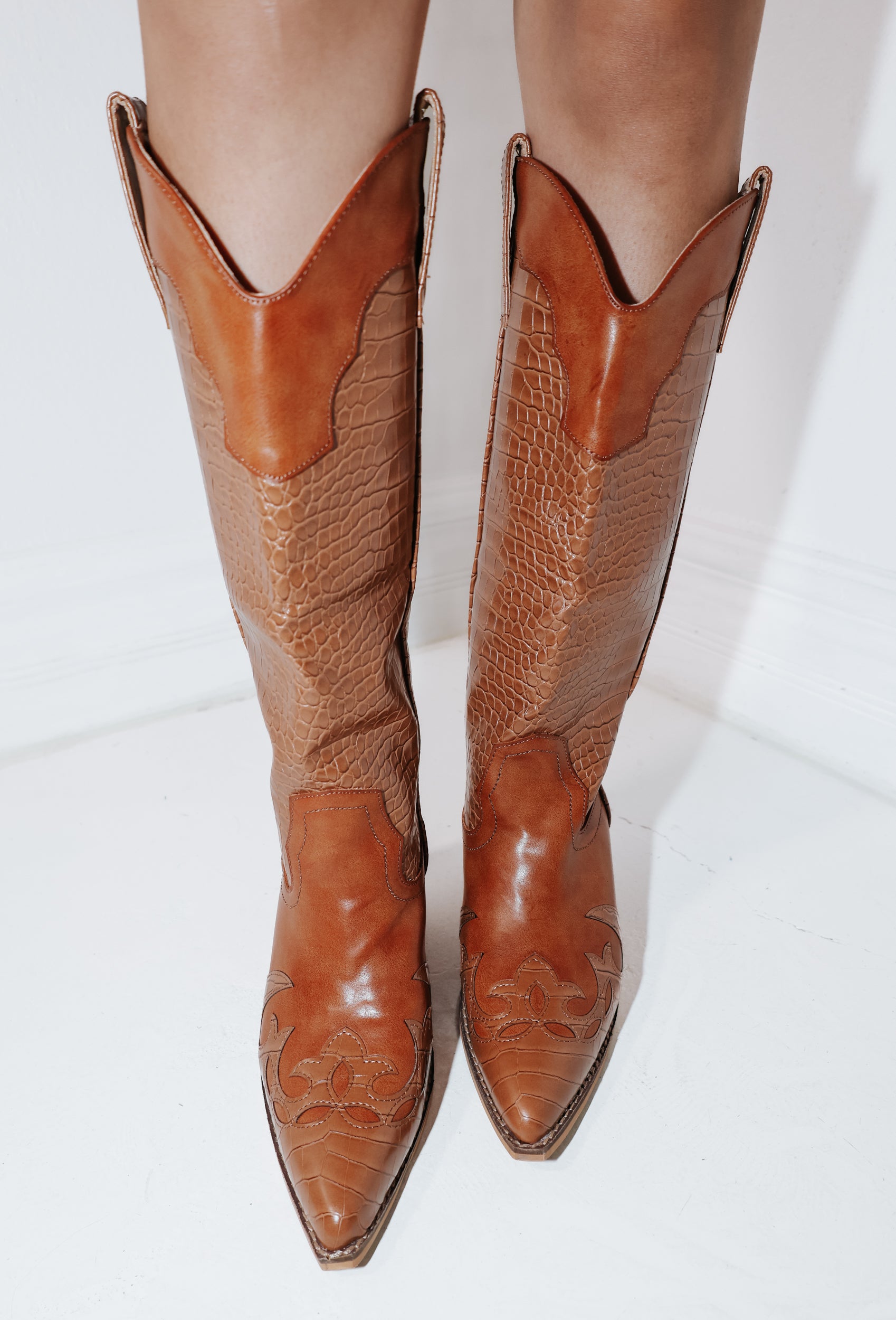 Experience luxury with a touch of western charm. Our Rustic Luxe Croc Boots feature a stunning crocodile print, pointed toe, and stacked heel. Designed for comfort and style, these knee-high boots will elevate any outfit. Available in whiskey brown to complete your look!
