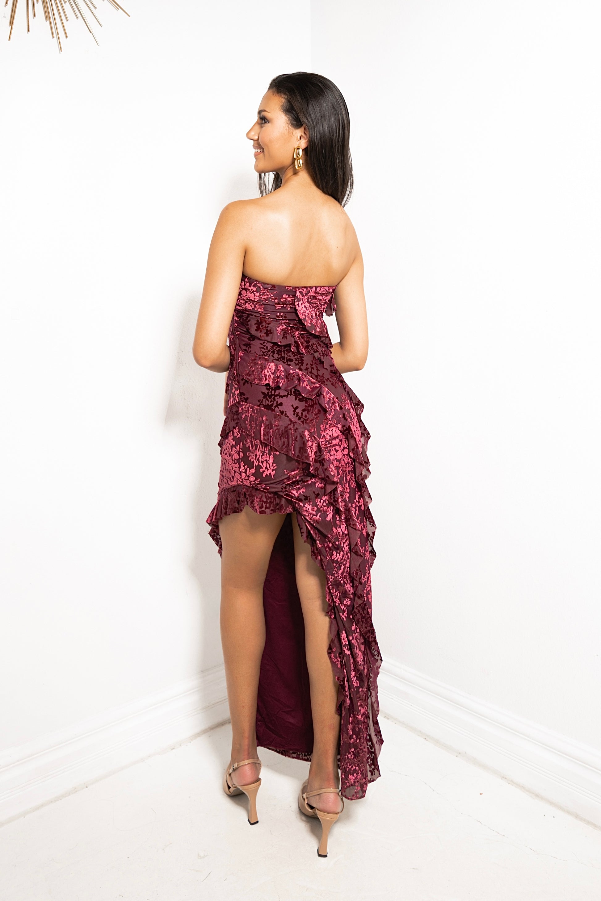 Crafted in a luxe crushed velvet, this dress shimmers with a rich, dimensional texture that catches the light beautifully. A cascading ruffle detail flows asymmetrically from bodice to hem, adding drama and movement with every step. The thigh-high slit brings just the right amount of allure, while the fitted silhouette flatters your shape. Perfect for winter galas, holiday soirées, or any evening where elegance is a must.