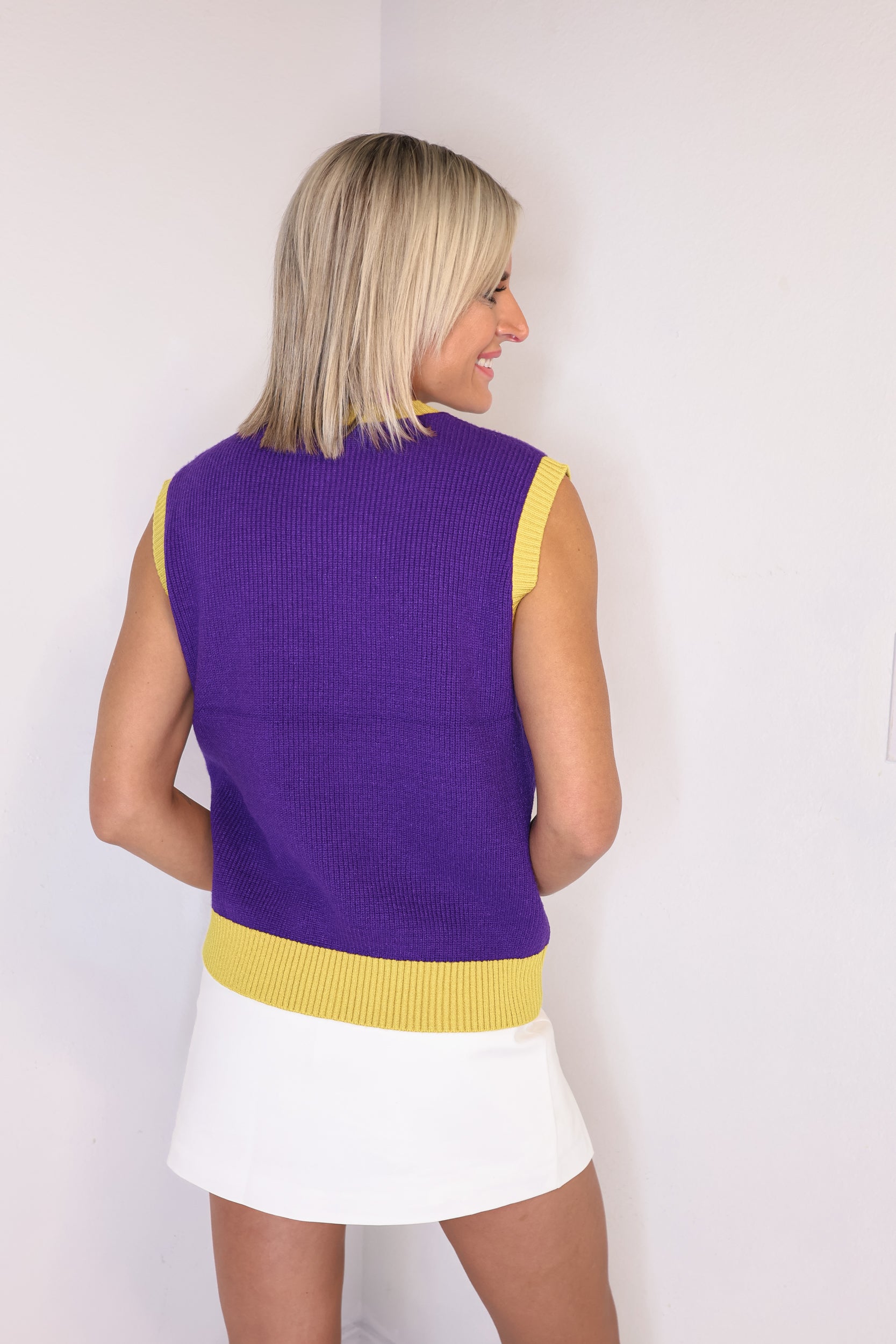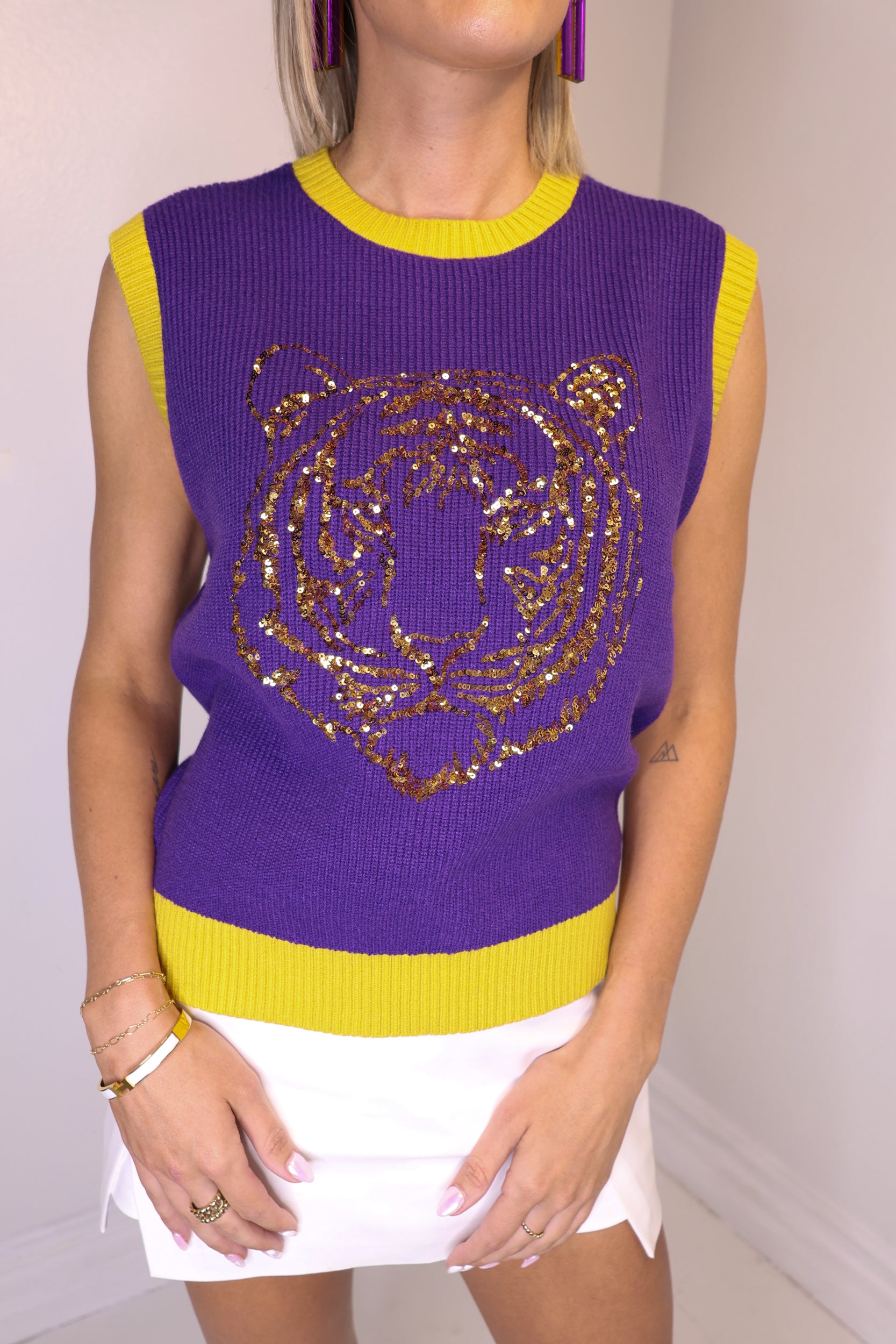 Elevate your look with our Sequin Tiger Sweater Vest. The intricate gold trim highlights the bold purple hue, while the sequin tiger head adds a touch of playfulness. Sleeveless and versatile, this luxurious piece is perfect for making a statement.