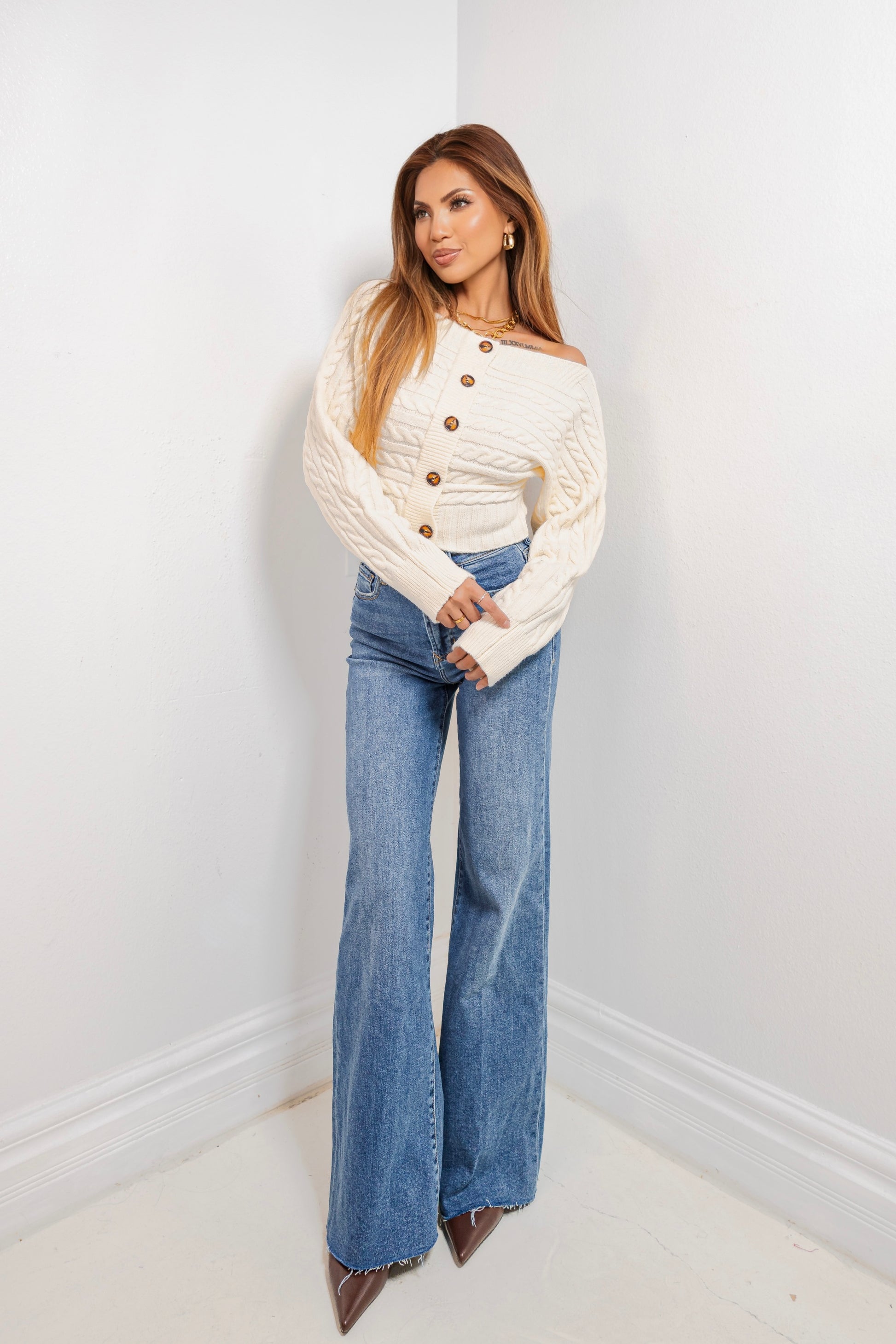 Cozy meets chic with this cropped cable knit cardigan, designed with a flattering button-front closure and a touch of modern edge. The chunky knit texture and bold tortoise buttons give it timeless charm, while the cropped length makes it perfect for pairing with high-waisted denim or skirts. Wear it buttoned up for a polished look or slightly off-the-shoulder for a flirty, laid-back vibe.