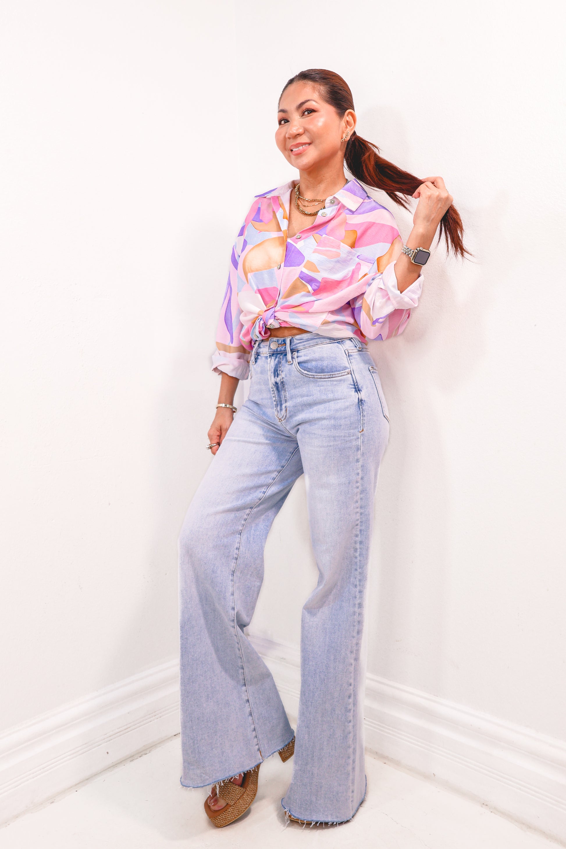 Our Sorbet Skies Abstract Button Down Top brings vibrant energy to your wardrobe with its stunning multicolor abstract print. Featuring a flattering collared neckline and comfortable long sleeves, this versatile piece transitions seamlessly from office to evening. The classic button-down design ensures a polished look while the artistic pattern adds a touch of creative expression to any outfit.