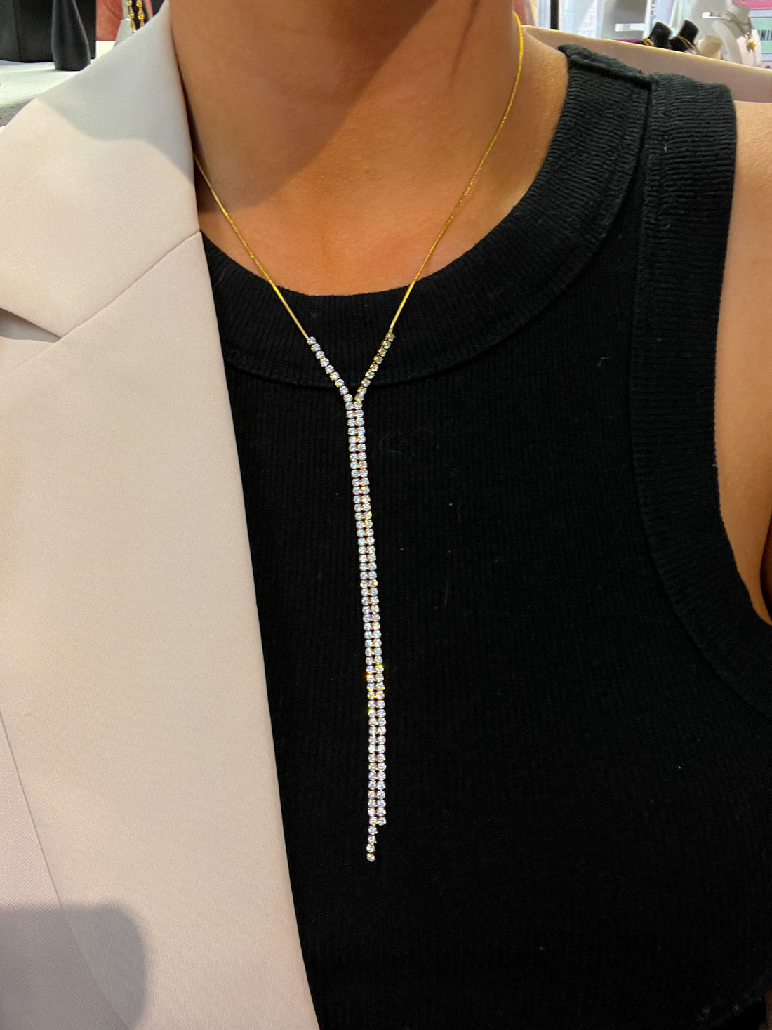 The Brooke Necklace features a sleek gold-tone chain with a stunning Y-shaped design, adorned with a cascading line of sparkling white stones. The minimalist gold chain contrasts beautifully with the brilliance of the stones, creating a refined and elegant aesthetic. The Y-drop style elongates the neckline, making it a perfect accessory for both casual and formal outfits. Its versatile design adds sophistication while remaining understated, making it a standout piece for any jewelry
