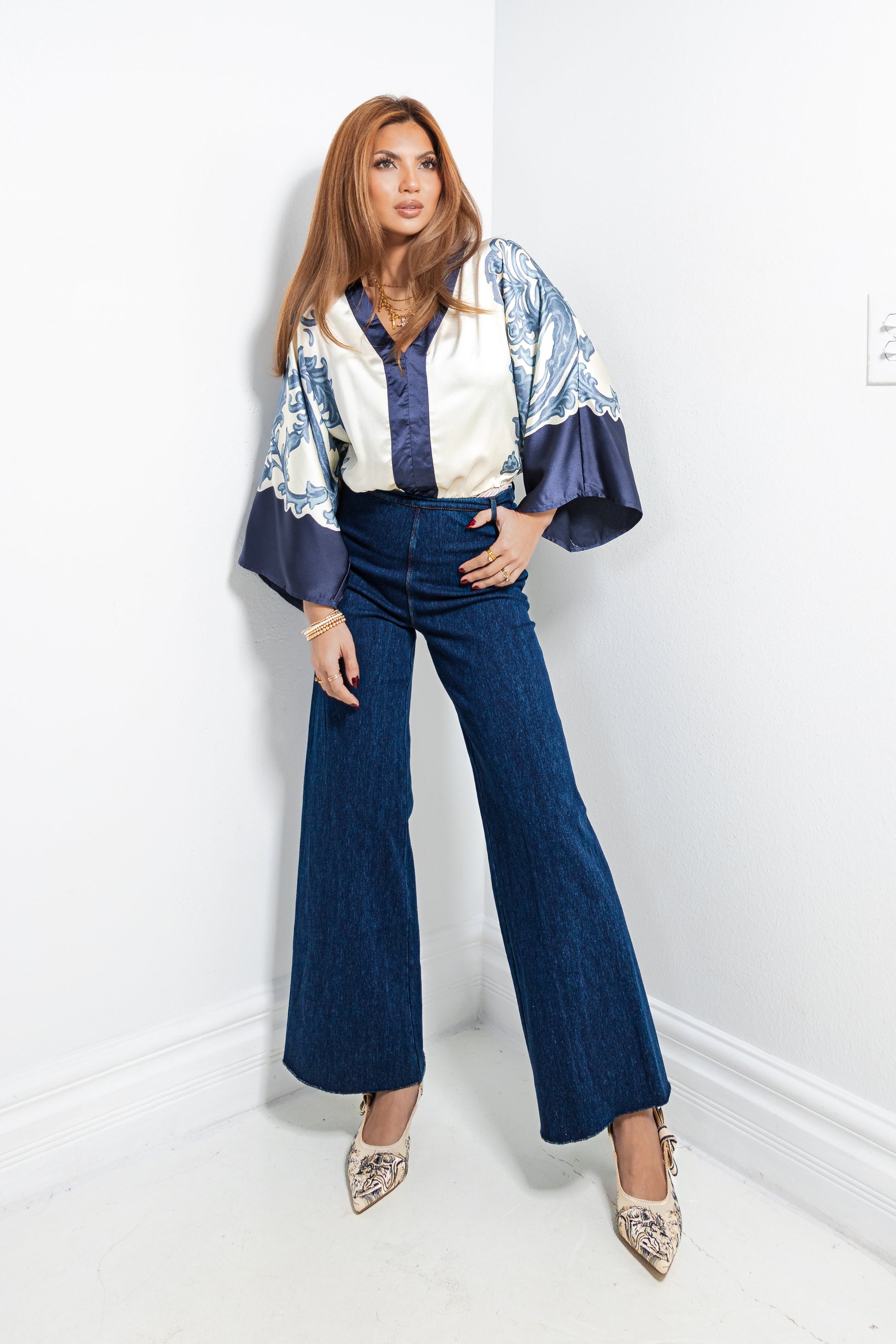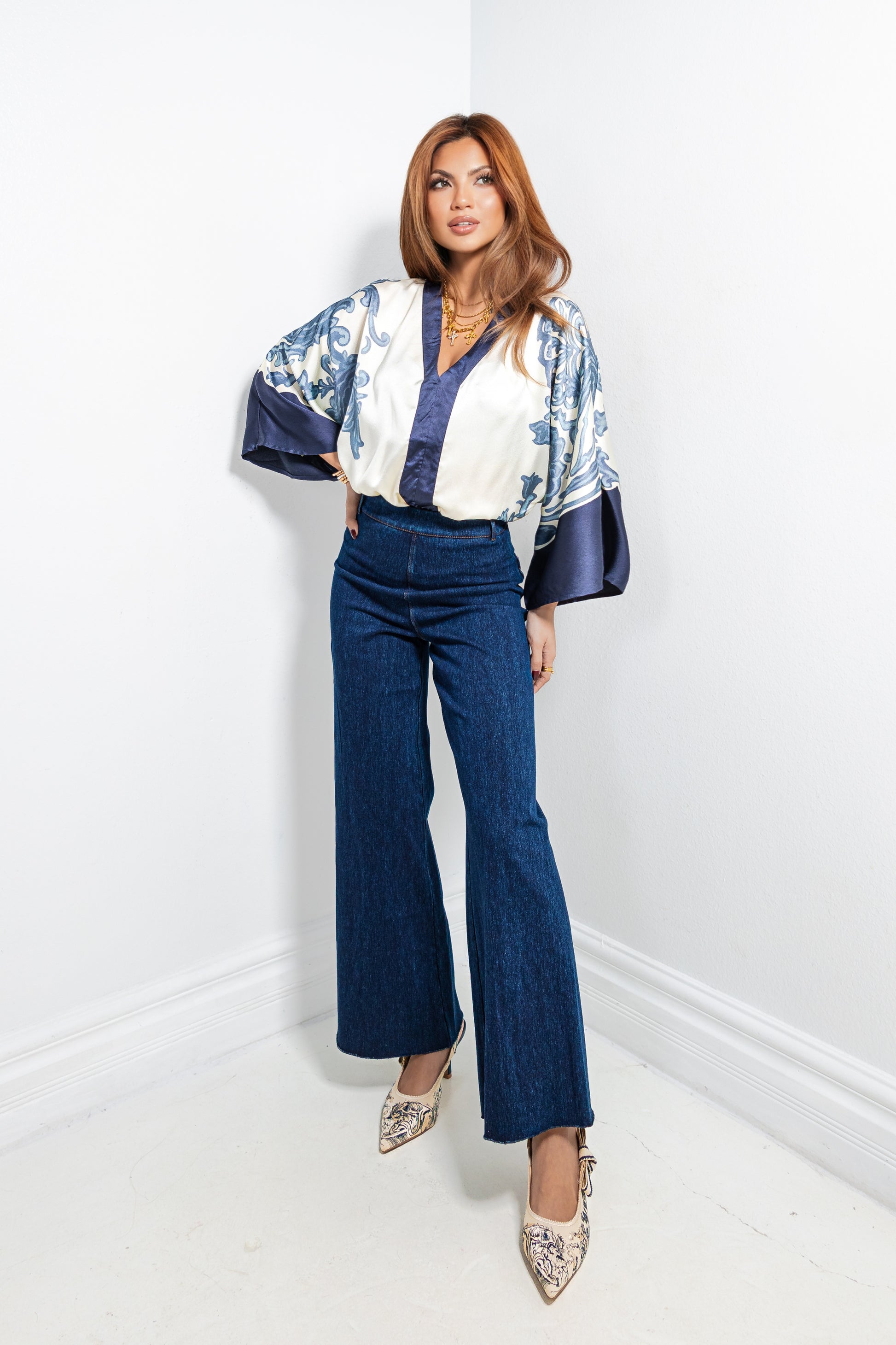 Sophisticated and effortlessly chic, the Capri Coast Satin Bodysuit brings an elegant touch to any look. Crafted in a silky ivory fabric with navy trim and baroque-inspired detailing, this statement piece features a deep V-neckline, wide kimono sleeves, and a flattering wrap silhouette that ties perfectly at the waist.