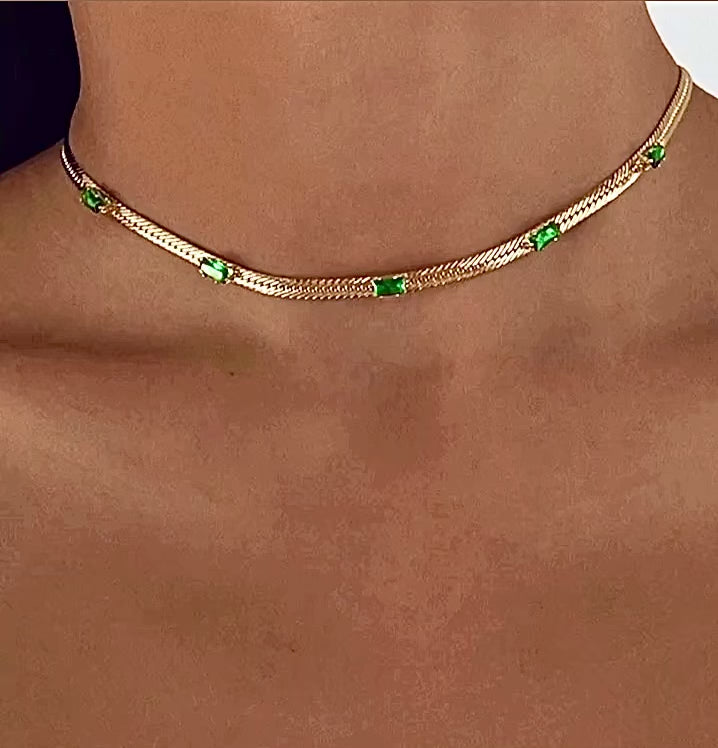 "The "Emerald Hailey" necklace is a must-have for any jewelry collection. This 18k gold plated choker can be easily layered with other necklaces, and its square rhinestone details add just the right amount of sparkle. Elevate any outfit with this elegant and versatile piece."
