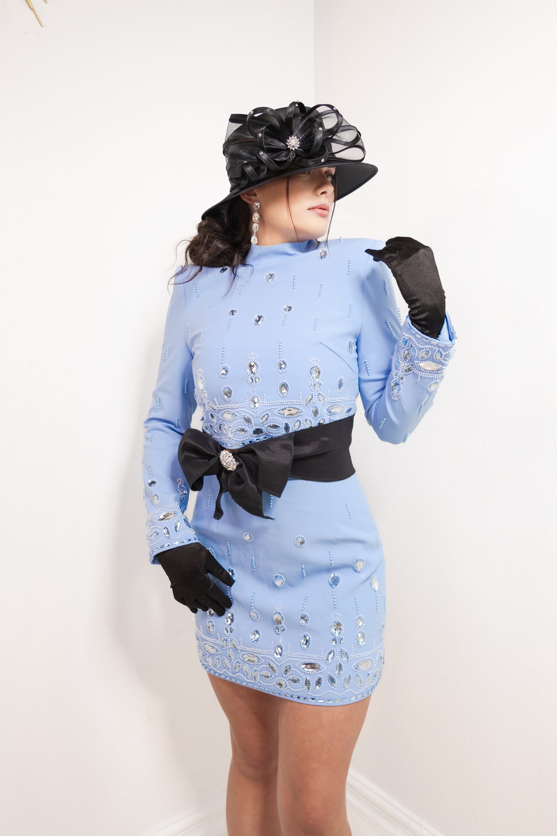 The high neckline and tailored silhouette bring elegance and sophistication, while the all-over rhinestone and beadwork add an irresistible dose of sparkle. The lower bodice and sleeves are decorated with intricate oval and marquise-cut gem patterns layered over tiered panels, creating a dimensional and couture-inspired finish.