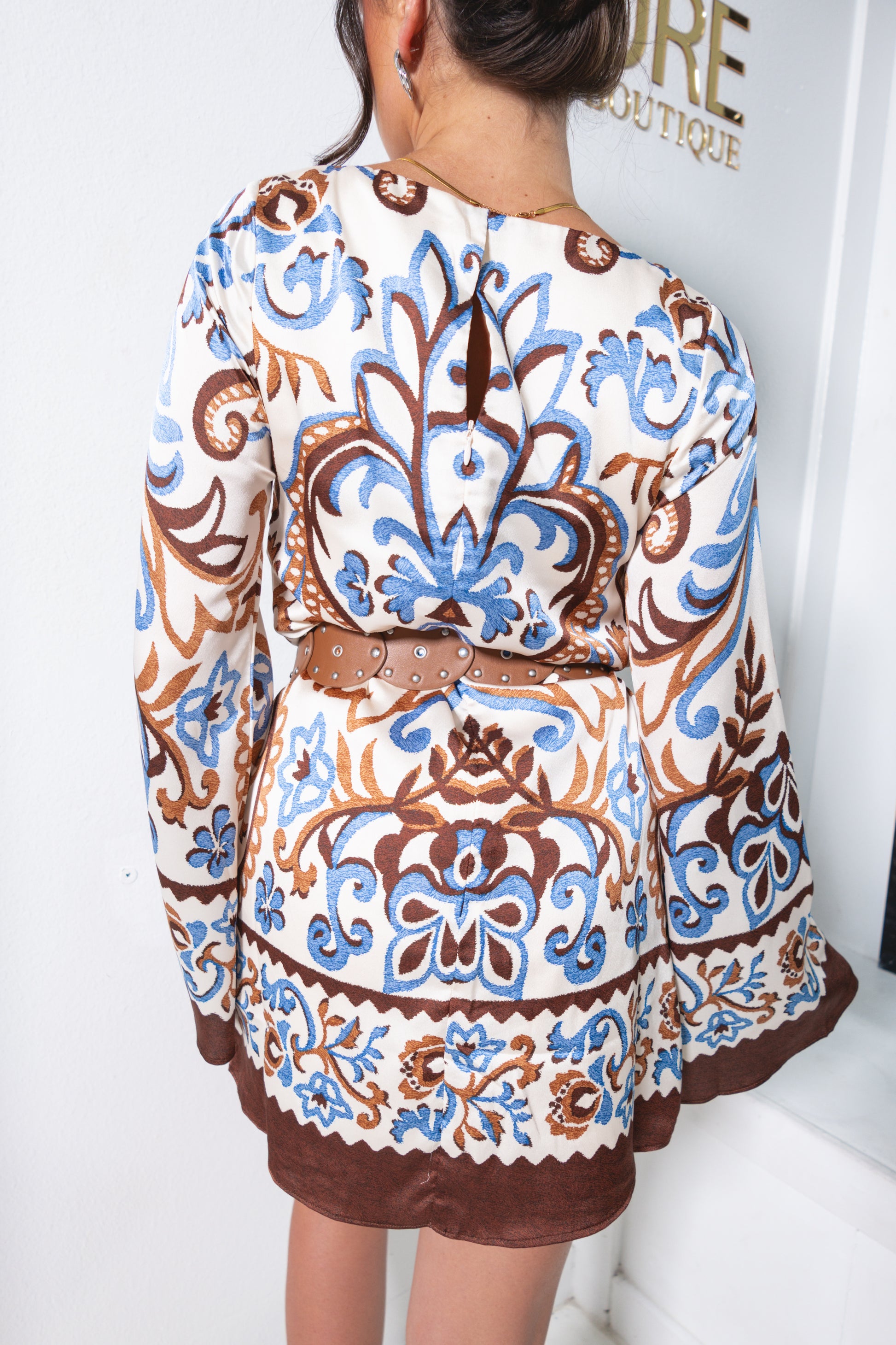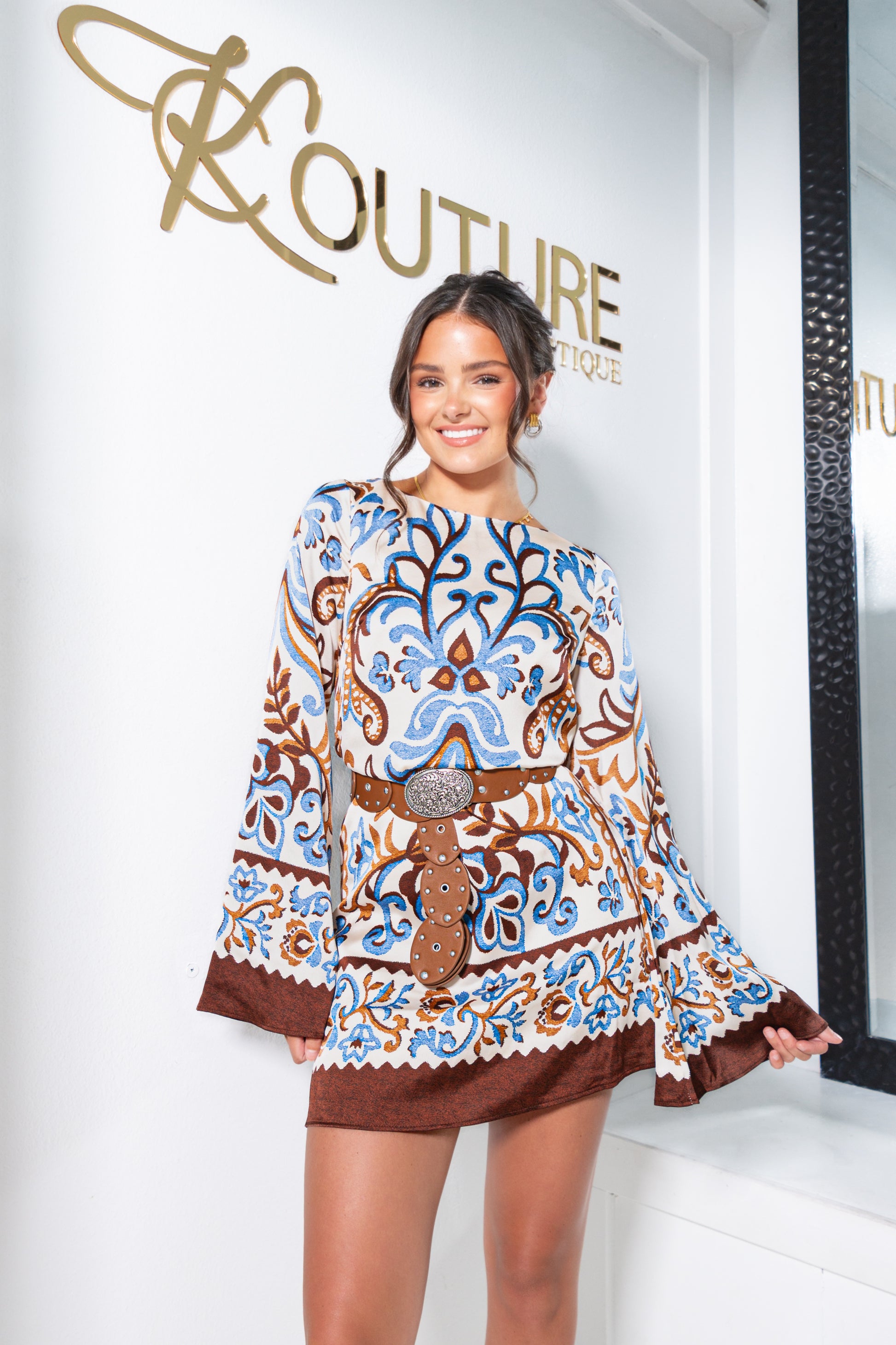 Rustic charm meets effortless elegance in this Western Grace Long Sleeve Mini Dress. Featuring a striking allover baroque-inspired print in warm mocha brown, soft sky blue, and neutral beige tones, this dress blends vintage flair with bohemian spirit. The relaxed silhouette, wide sleeves, and bold border detailing give it a timeless yet trendy feel that’s perfect for the modern cowgirl.
